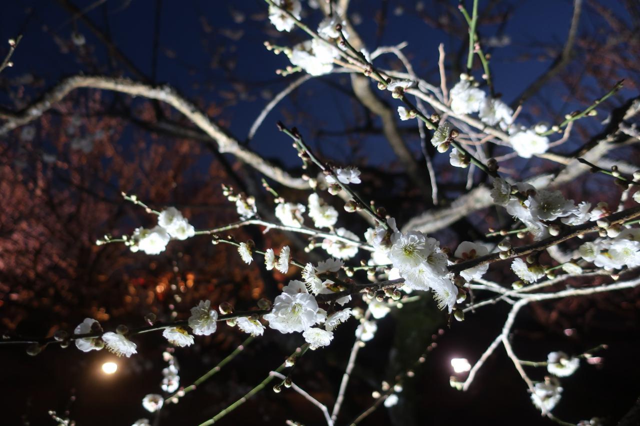 昼間講道館でみた梅も満開で美しかったのですが、夜のライトアップに浮かび上がる偕楽園の梅はまた格別でした。