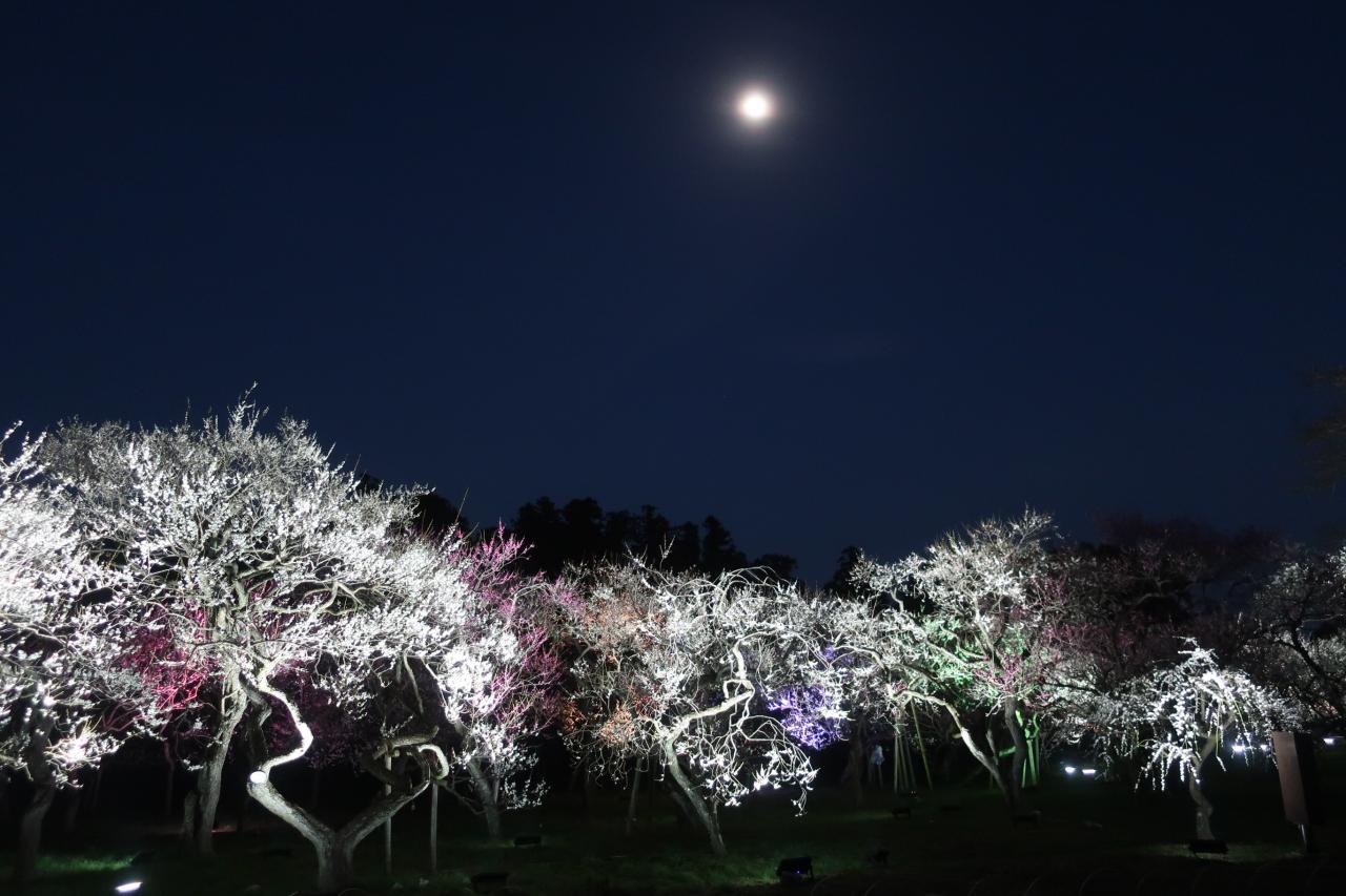 ライトアップされた幻想的な梅林と月が美しい。
