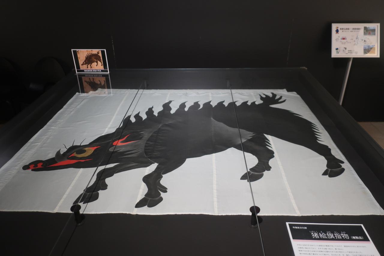 鎌倉時代から約400年間この地を支配した真壁氏が戦陣に掲げた旗指物(はたさしもの)のレプリカが目を引きます。力強いイノシシの姿はかなりの迫力です。 -