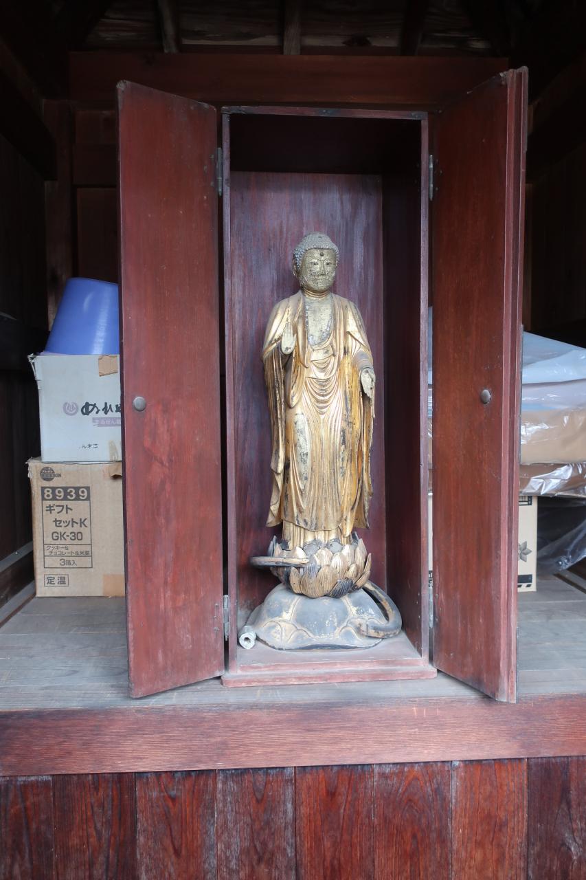 薬師如来堂。仏像の後ろの段ボールやバケツが味わい深い。