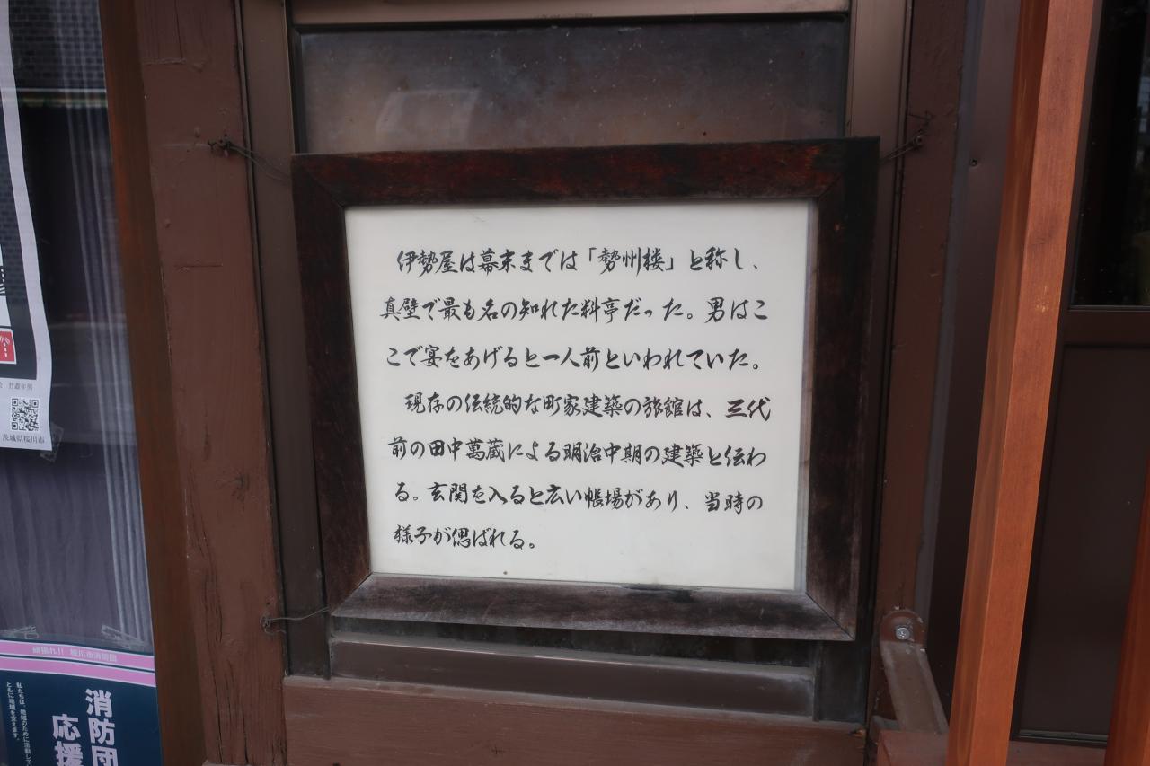 『伊勢屋は幕末までは「勢州楼」と称し、真壁で最も名の知れた料亭だった。男はここで宴をあげると一人前といわれていた。現存の伝統的な町家建築の旅館は、三代前の田中萬蔵による明治中期の建築と伝わる。玄関を入ると広い帳場があり、当時の様子が偲ばれる。』と書かれています。