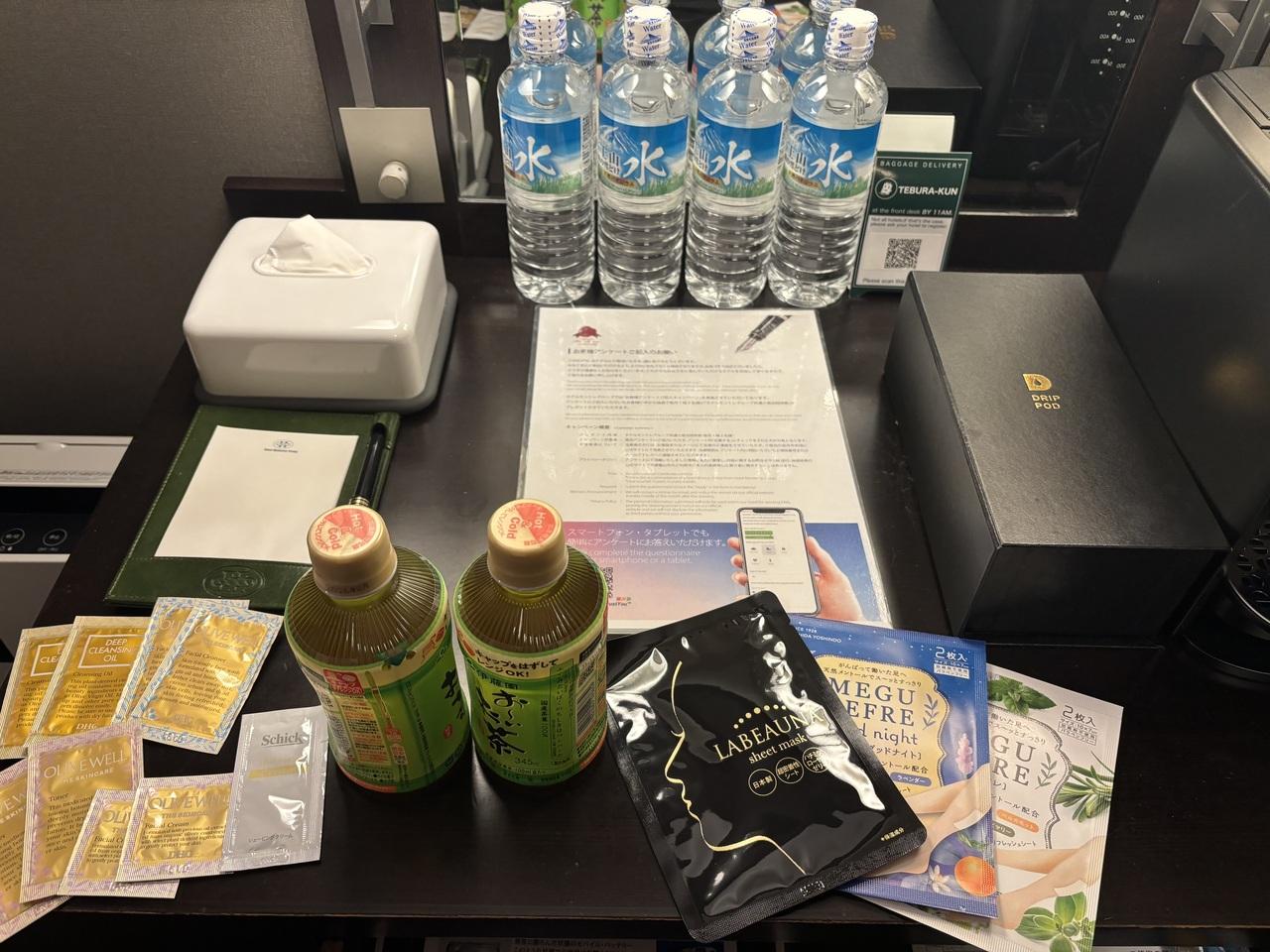 手前のペットボトルや化粧水などはフロント前でいただけるウェルカムドリンクやアメニティです。ホテルモントレ赤坂 宿・ホテル