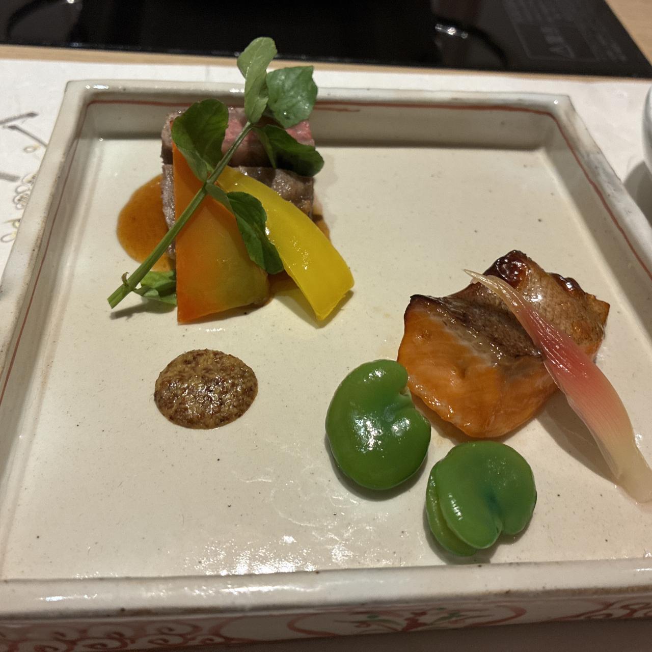 桜鱒西京焼き、酢鶏茗荷、一寸豆、和牛ロース グレービーソース