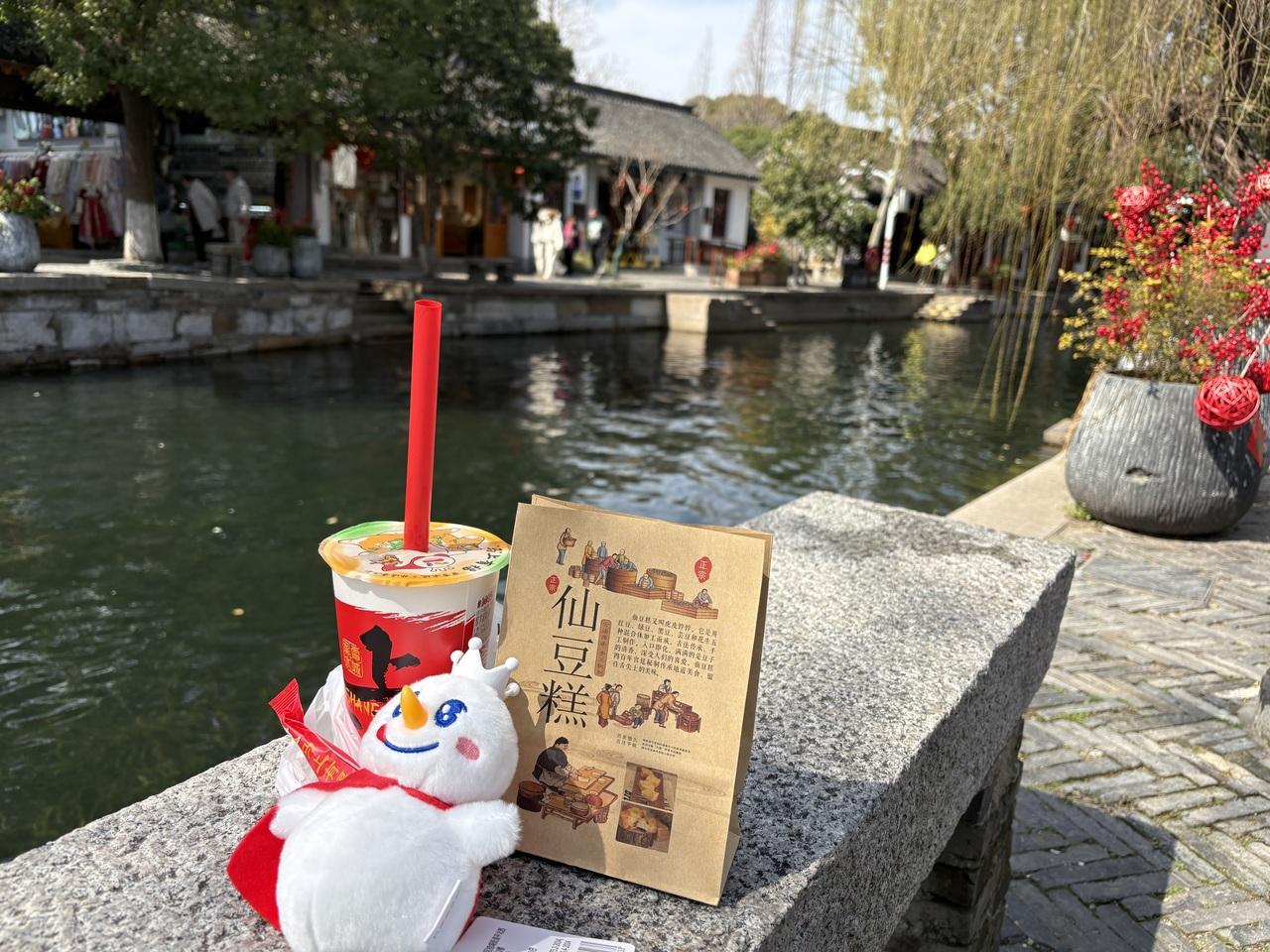 雰囲気が良かった川沿いに戻って、買ったおやつと、MIXIEで買った厚芋泥奶茶のプリントッピング(10元)を頂く。プリンは飲んでいてよく分からなかったけれど、芋ペーストの主張は強くてすごく美味しかった!キューブ型おやつは、緑豆はややパサパサで豆の味がダイレクトな感じで、栗はしっとりと甘さ強めで、栗の方がより好きだった。MIXIEで買ったぬいぐるみは、10元と激安。