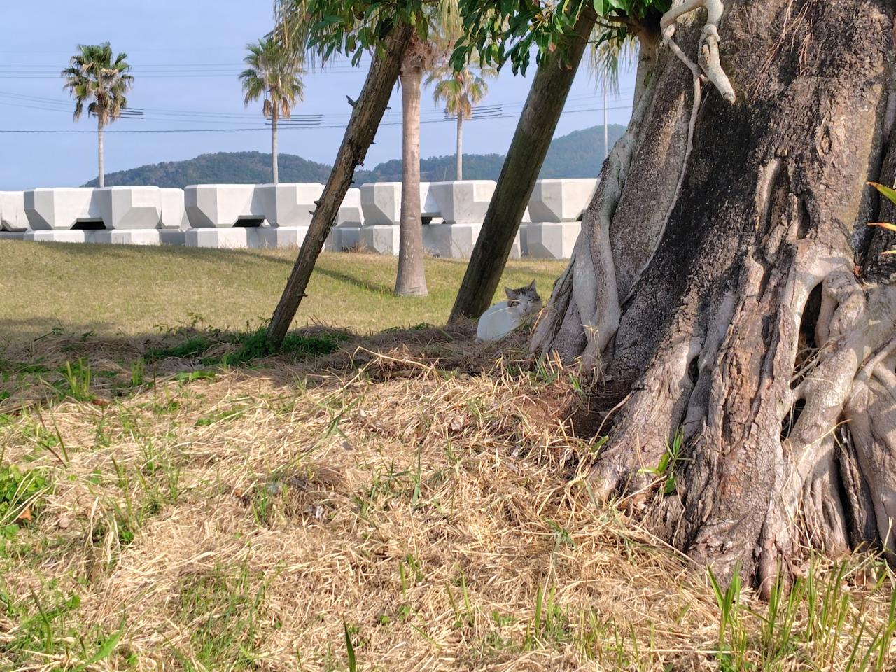 朝は知覧港の巨樹「五人番のアコウ」へ。猫3匹の寝床になっていた。こちらを警戒しながら寝ている。