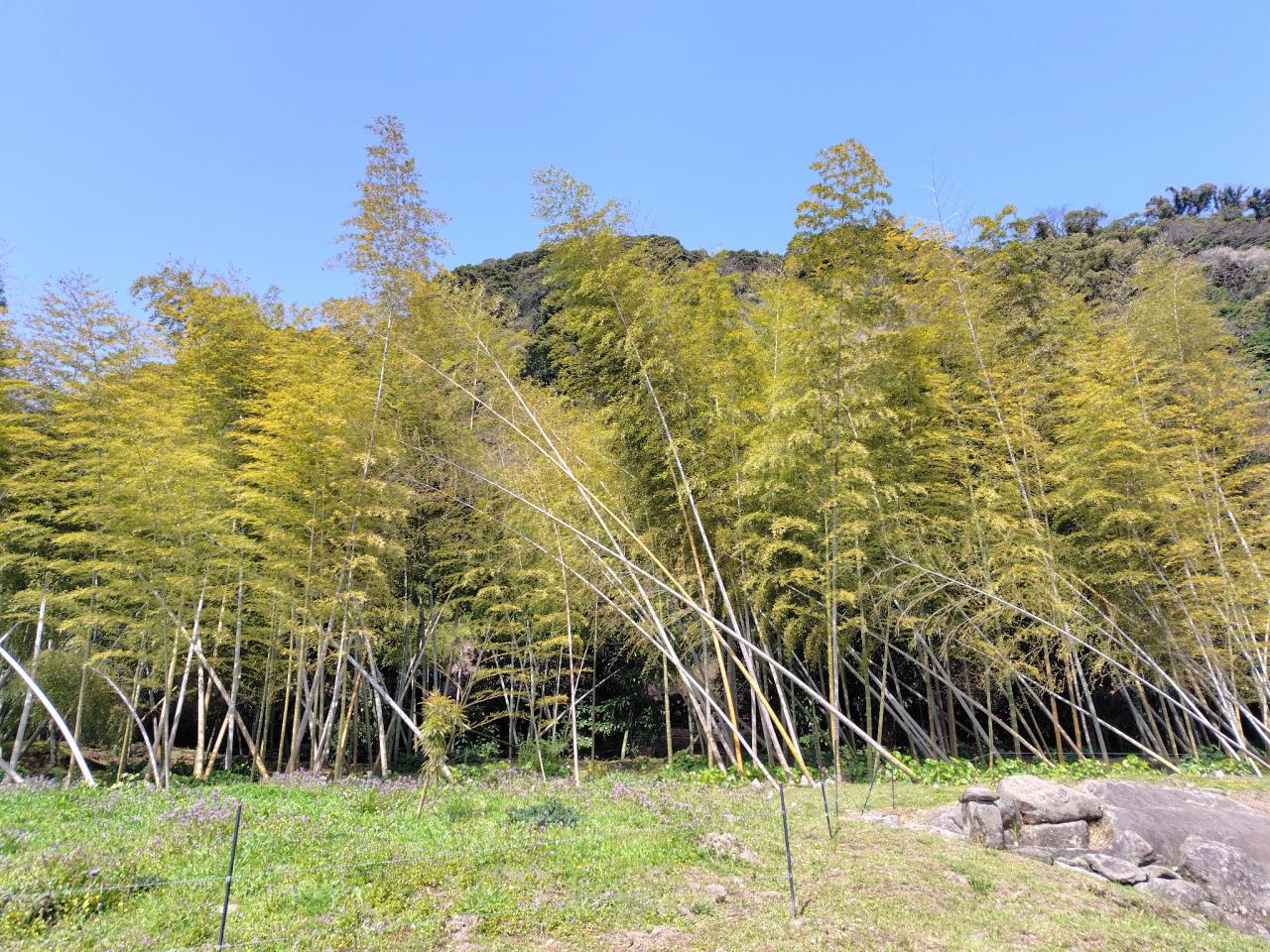 孟宗竹が錦江湾の潮風で傾いている。