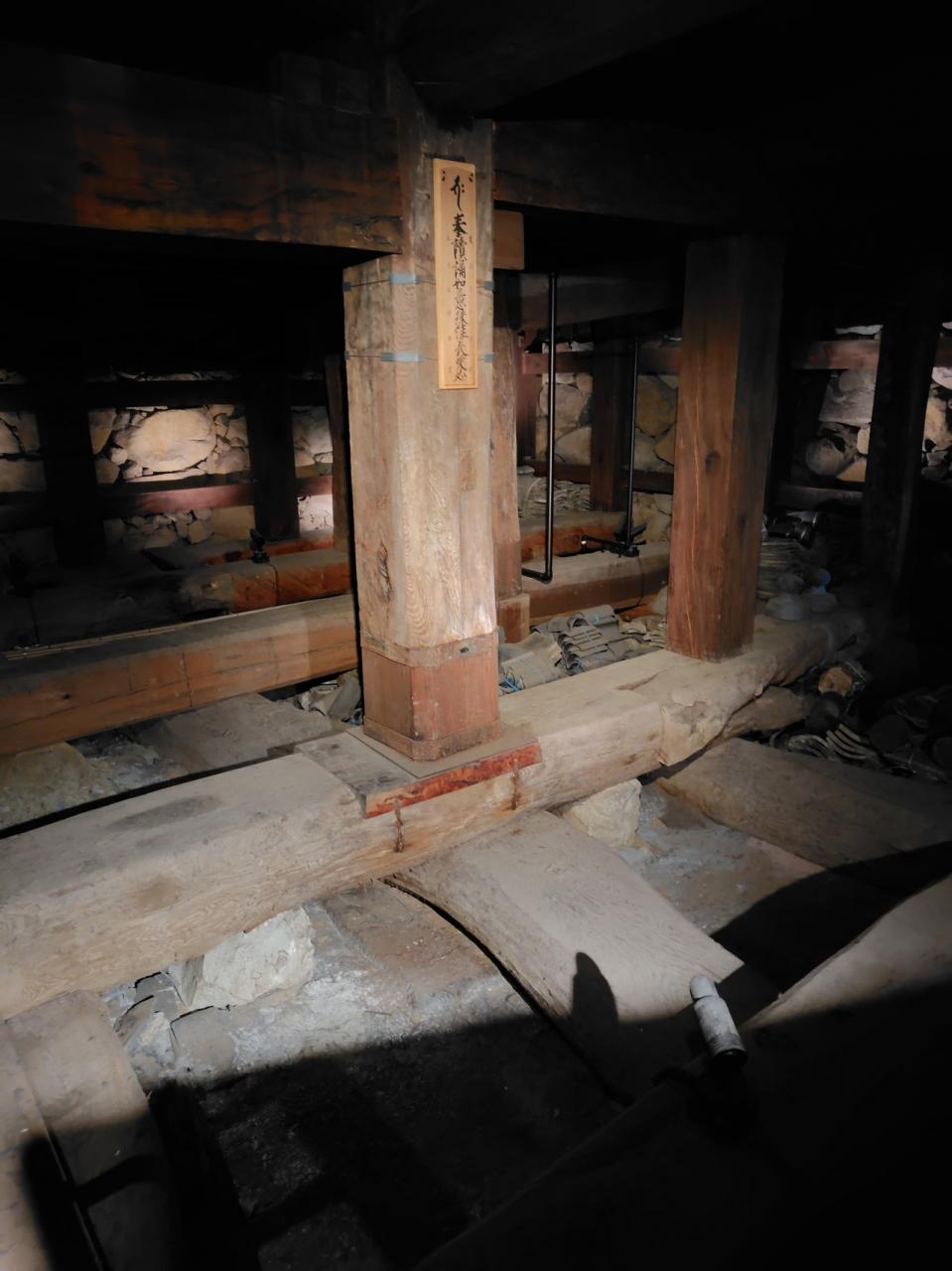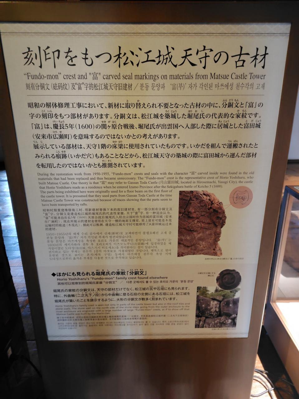 松江城は昭和25年に全解体による修理工事が行われています。その際、松江城を築城した堀尾氏の家紋である「分銅文」と「富」の字が刻印された古材が見つかっています。「富」の字は、富田城を意味しており、松江城築城の際に、富田城の部材を転用したのではないか、とも言われているんだとか。