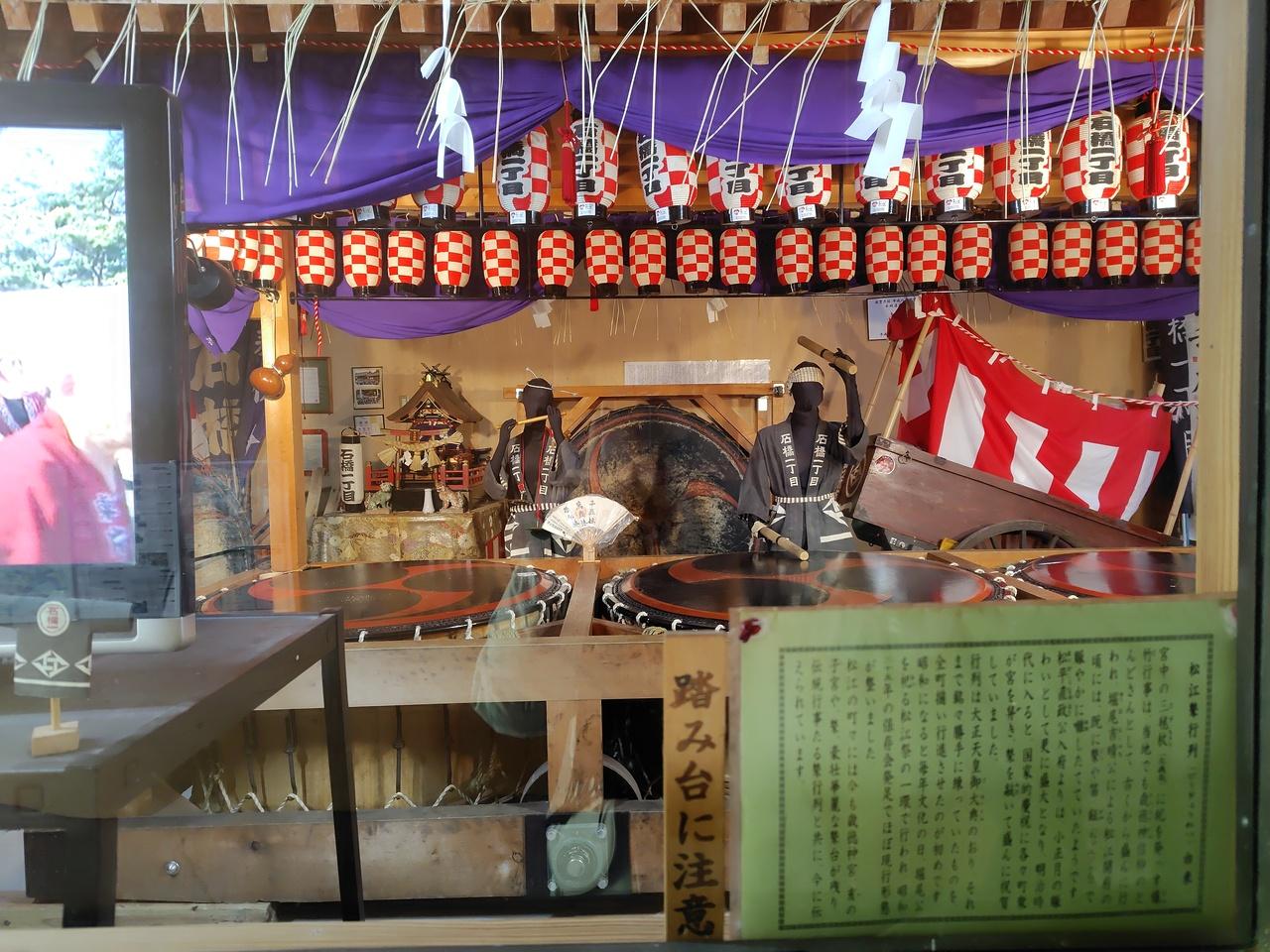 敷地内の北東奥に展示庫があり、「松江祭鼕行列」の鼕(どう)や、お祭りの映像が展示されていました。