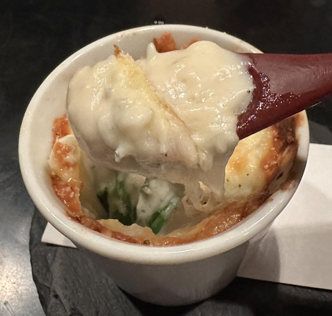 スプーンを入れると、クリーミーなホワイトソース(ベシャメルソース)の中に魚介類、野菜が入り、マリアージュしています。長生庵 グルメ・レストラン