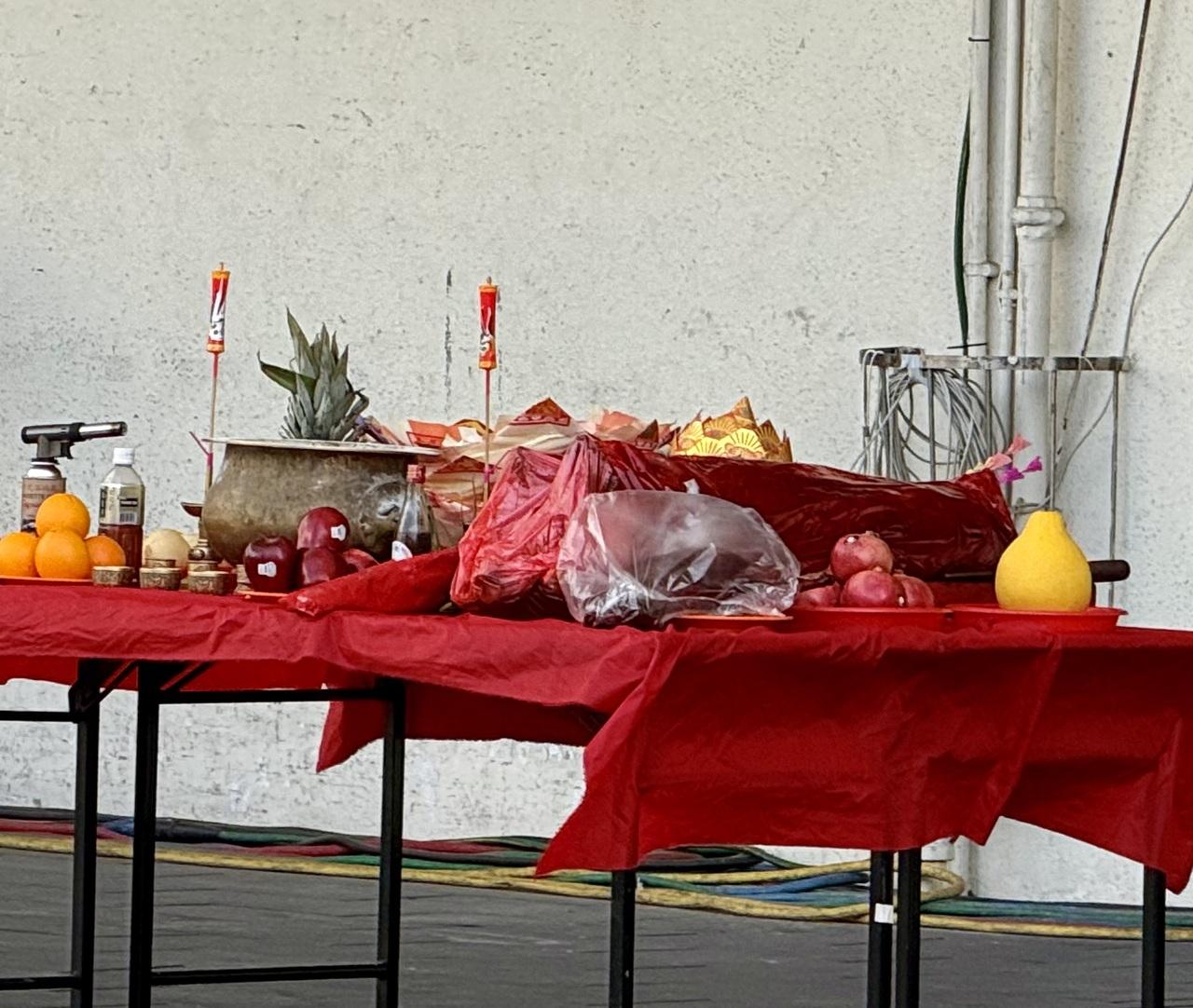 特別な日なので、拝神にも大きなお供え物の焼き豚が登場!