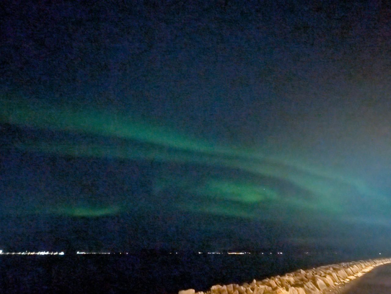 街の灯りとオーロラがキレイですね。