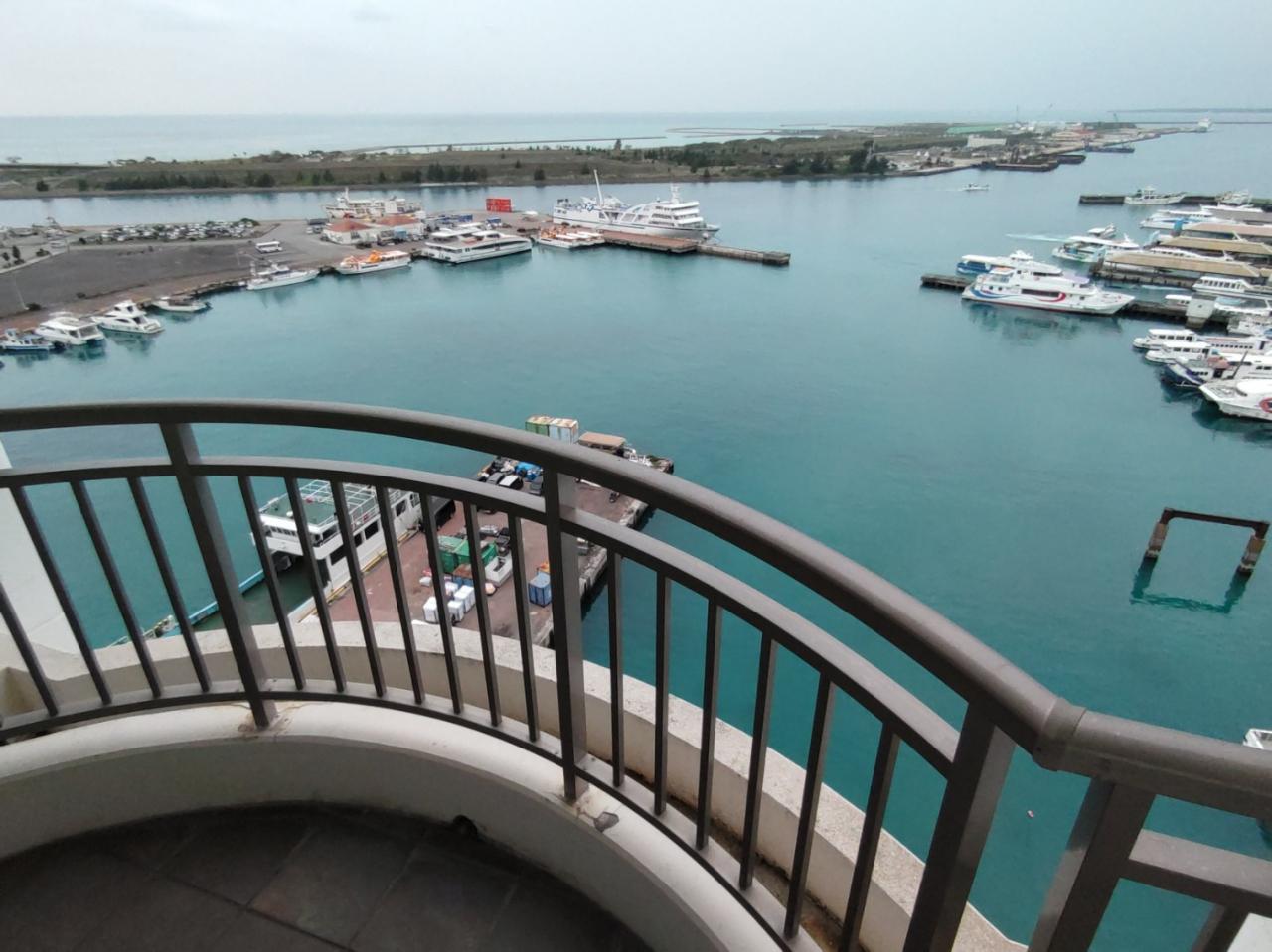 目の前に石垣港離島ターミナルが、その向こうに竹富島が見えます。