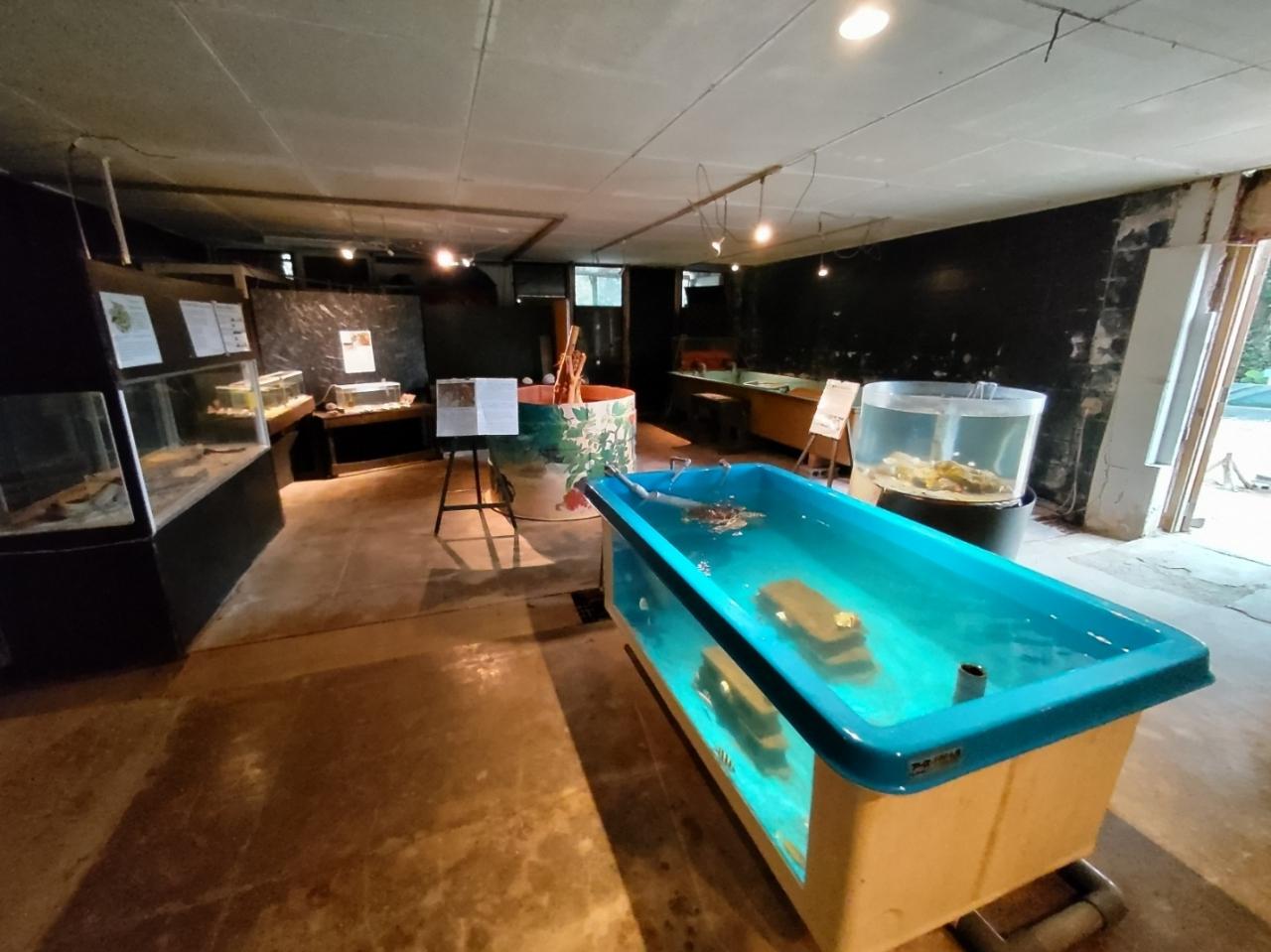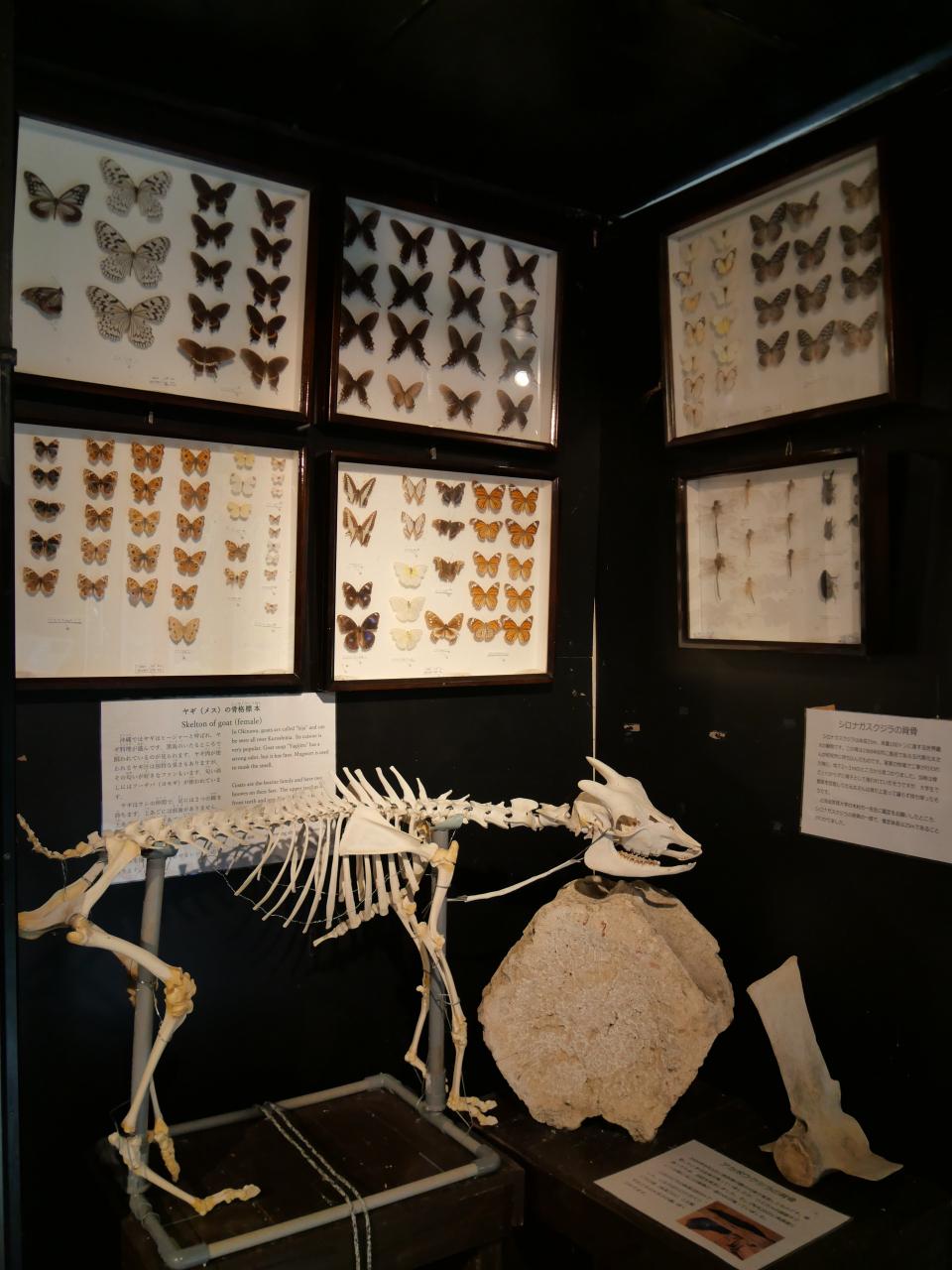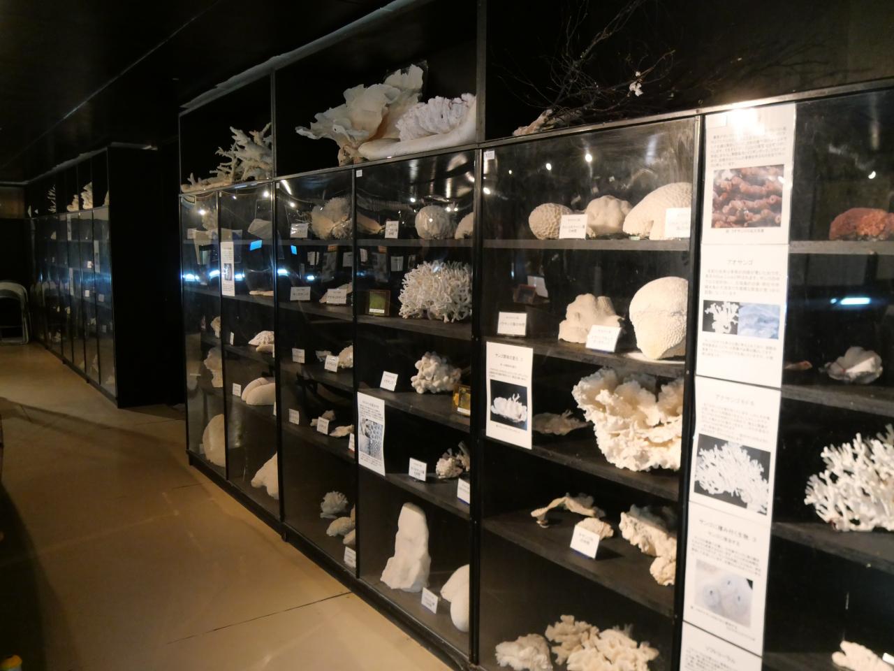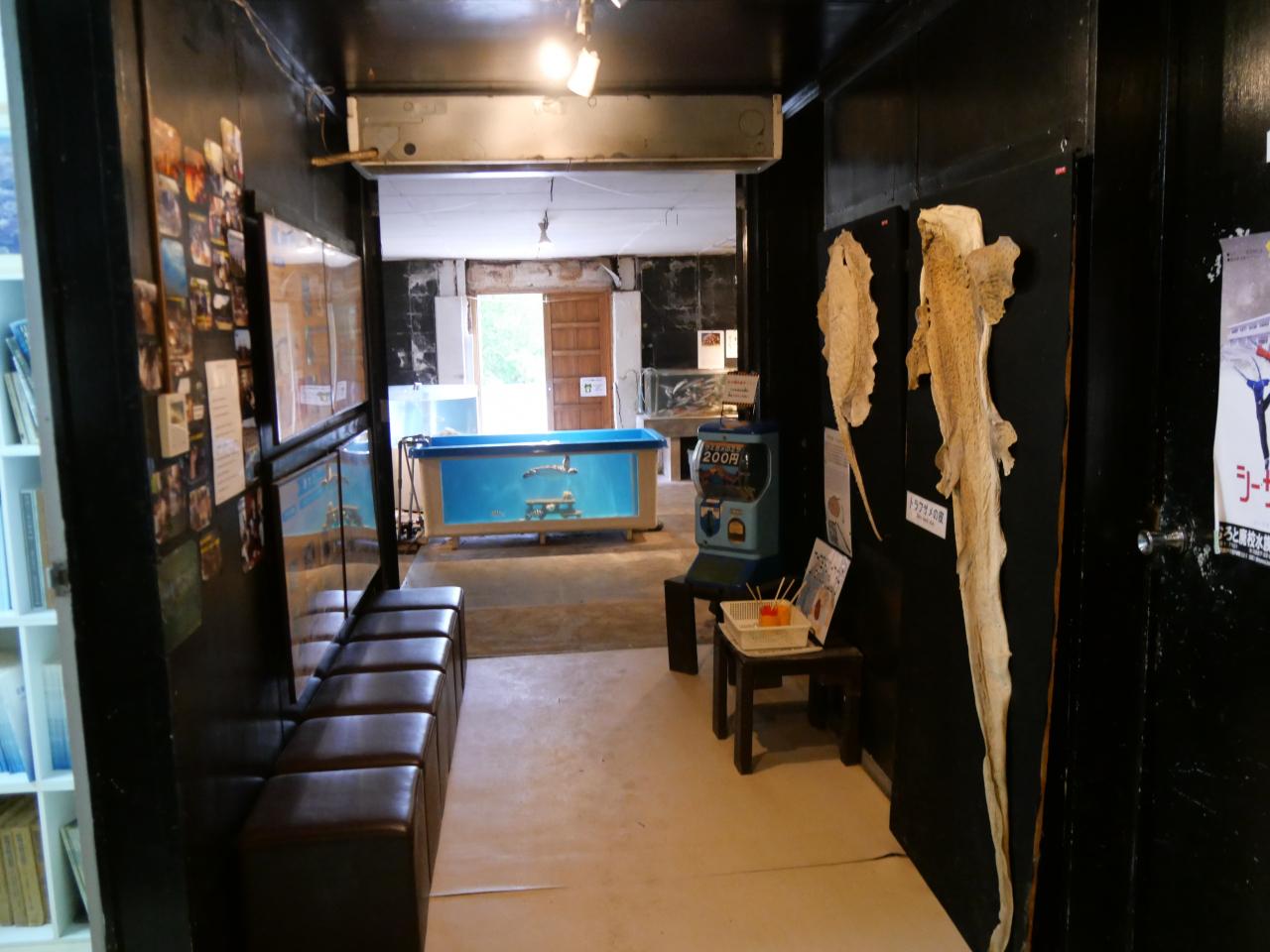 通路の壁にイバラエイとトラザメの皮が掛かっています。