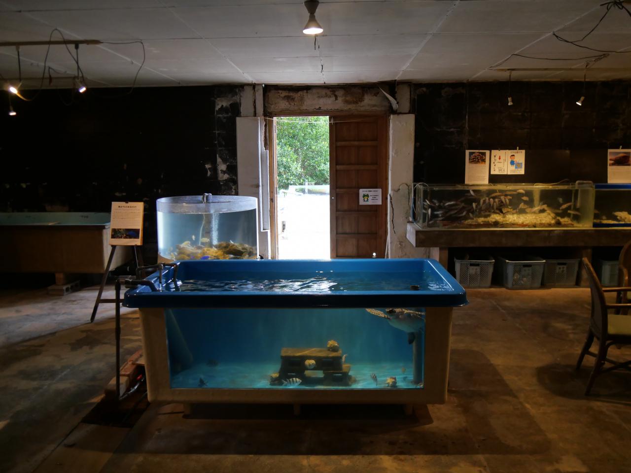 横の水槽では色鮮やかな熱帯魚が泳いでいます。 -