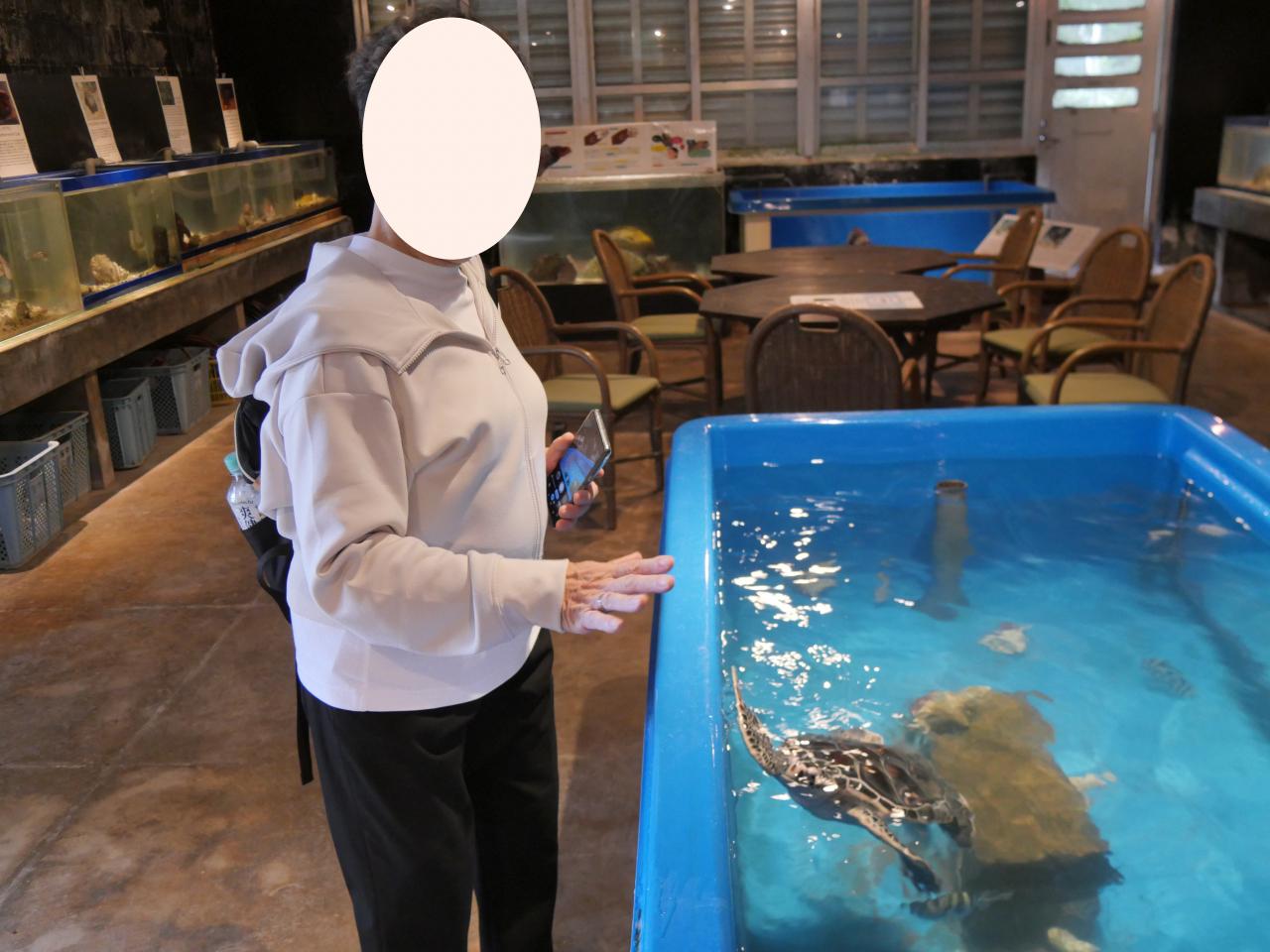 ジンベエザメの口から手を入れてくじを引いています。 -