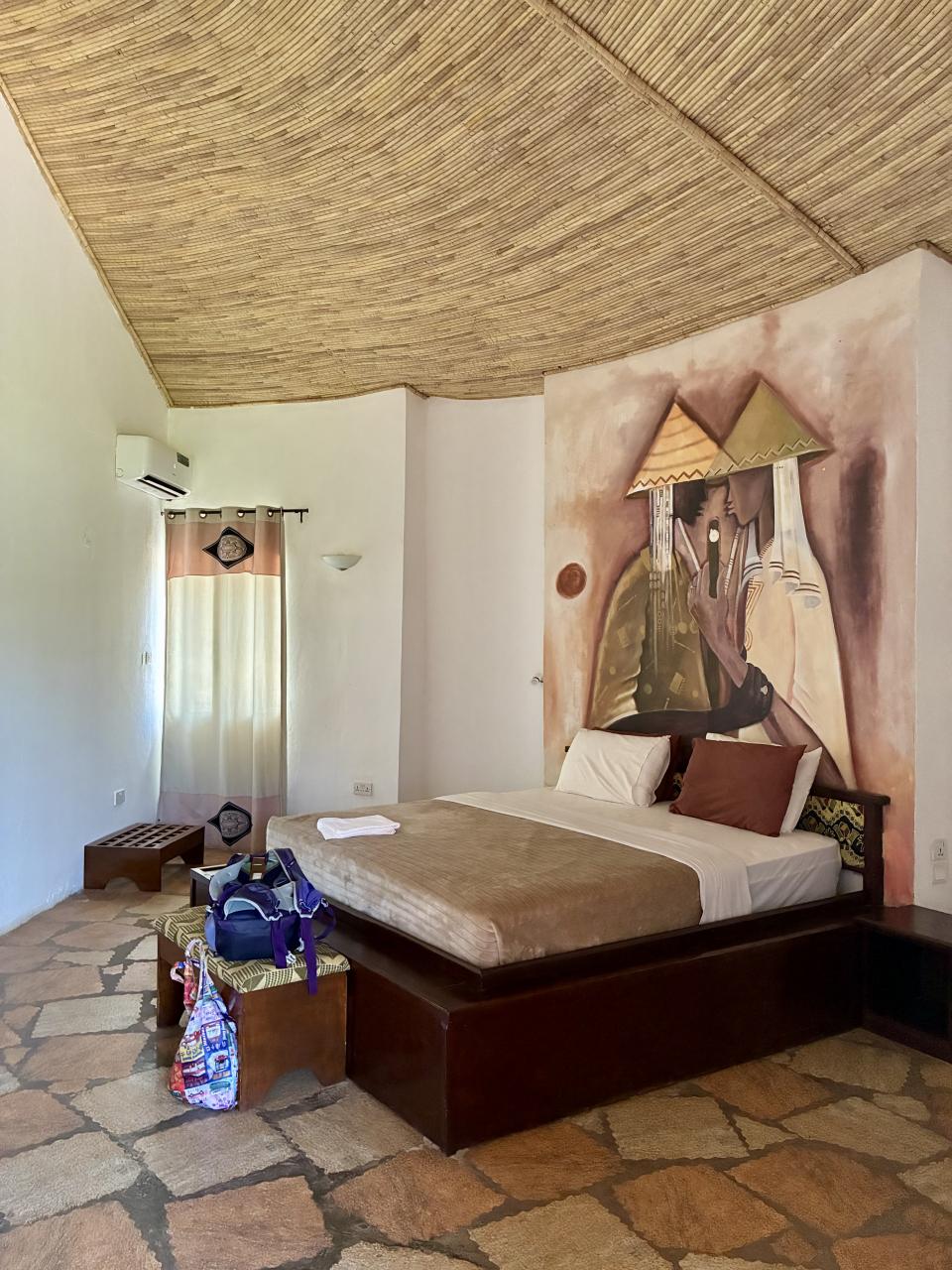 部屋はとても広い。ベッドもでかい。しかしやはり安いせいか、あちこちぼろいし、ケトルやお茶の類もなく、冷蔵庫もないし、タオルも1枚のみ。アメニティは固形石鹸だけ。まあ安いから贅沢は言いませんが、WiFiが不安定なのが致命的。ガンビアのesimは高かったので、最低限しか買っていない。