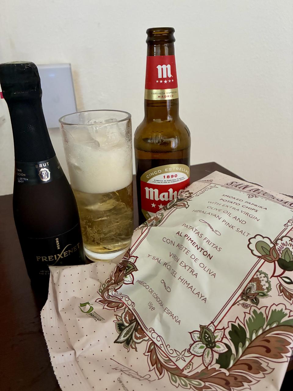 無事到着を祝って、乾杯!部屋に冷蔵庫ないからバーで氷もらってきた。スペインから持ち込んだ酒とポテチ。