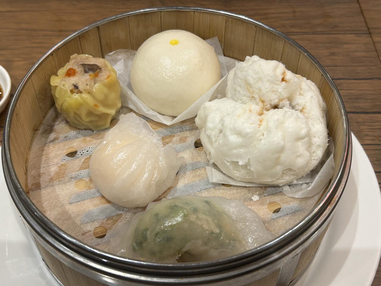 蒸し点心(焼売、海老餃子、チャーシューまん、カスタードまん、蒸し餃子)です。