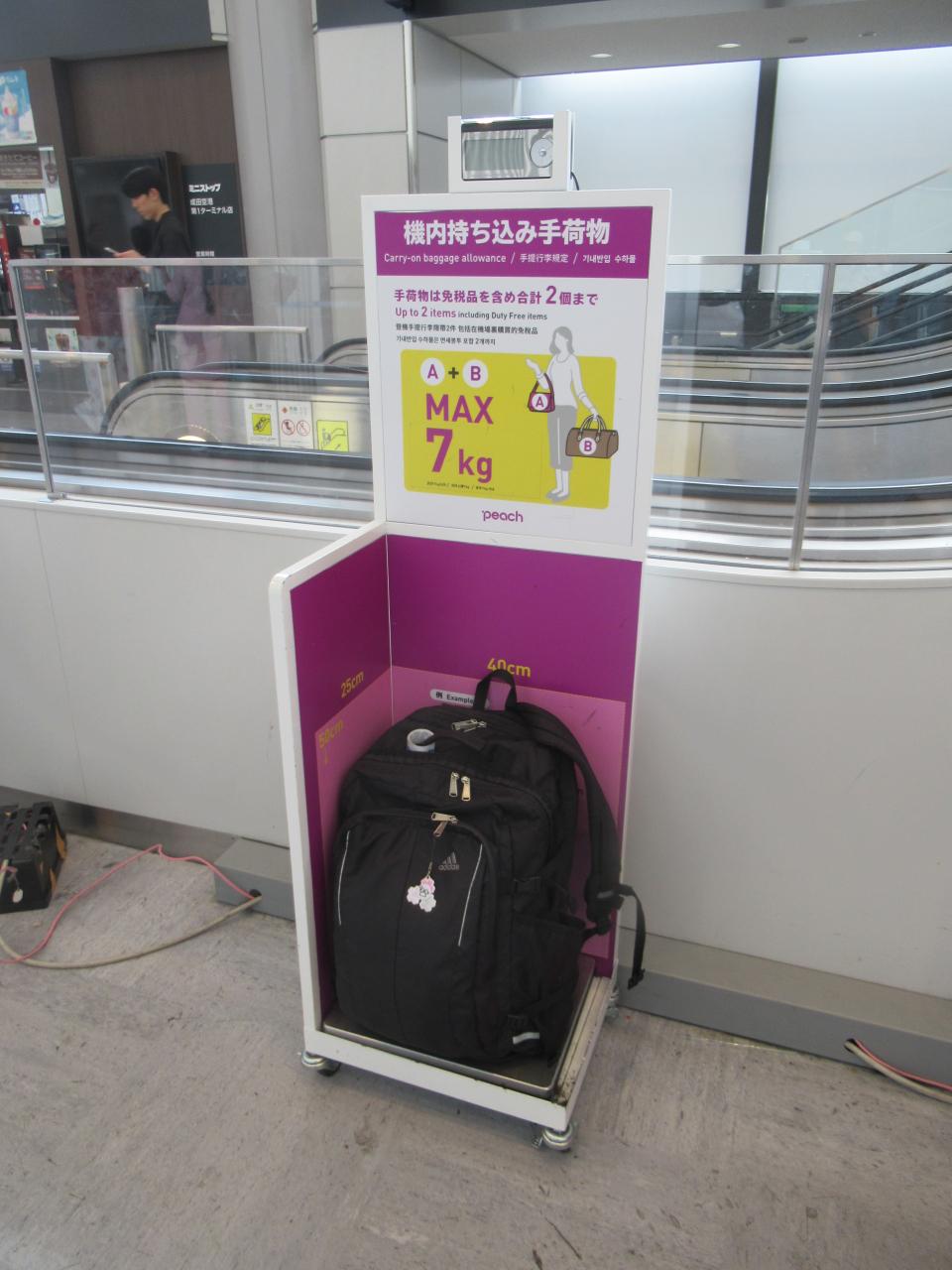 機内持ち込み手荷物は二つまででこの大きさ以内、二つ合わせて7kgまで。