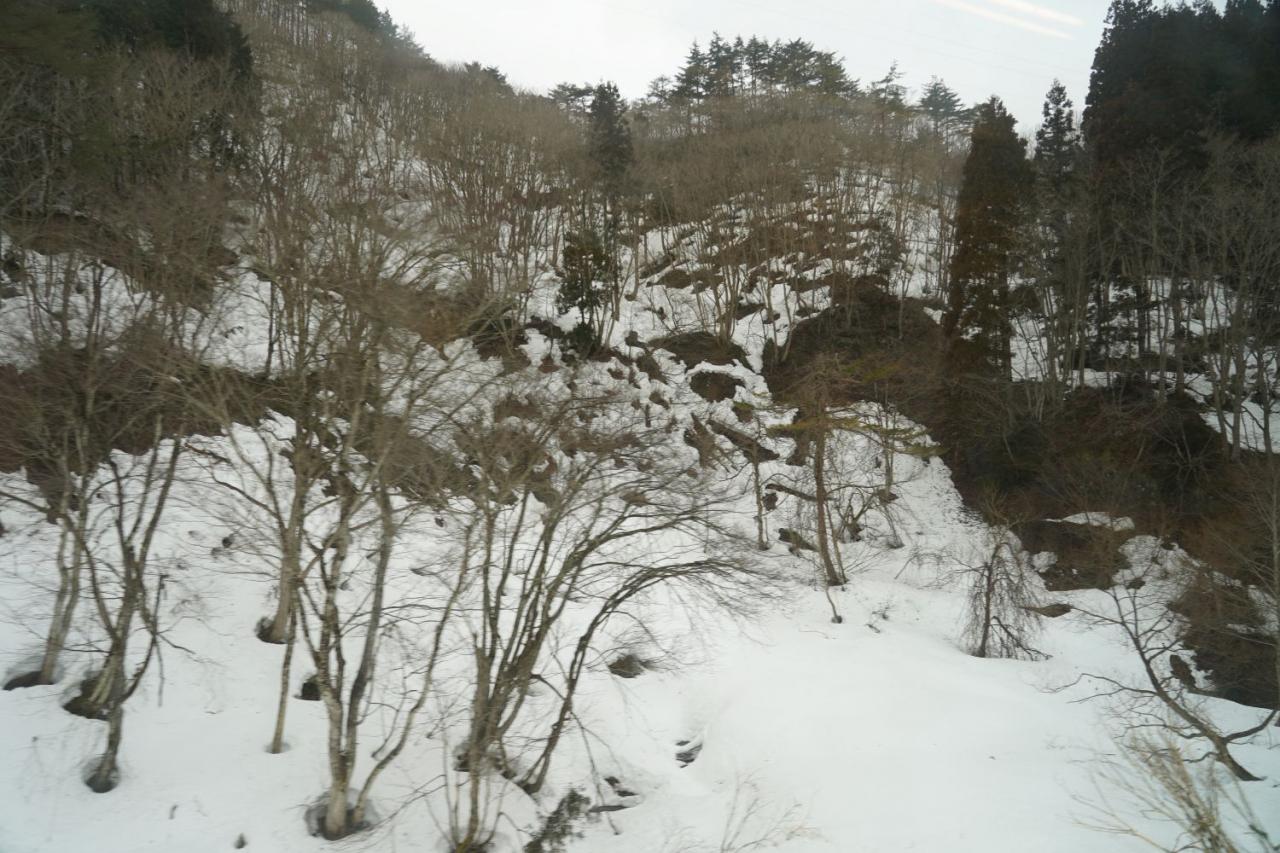 福島駅からは、在来線へと入る。新幹線とは思えないほど長閑な走りっぷりである。板谷峠に差し掛かると、冬に戻ったかのように、まだ多くの雪が残っていた。