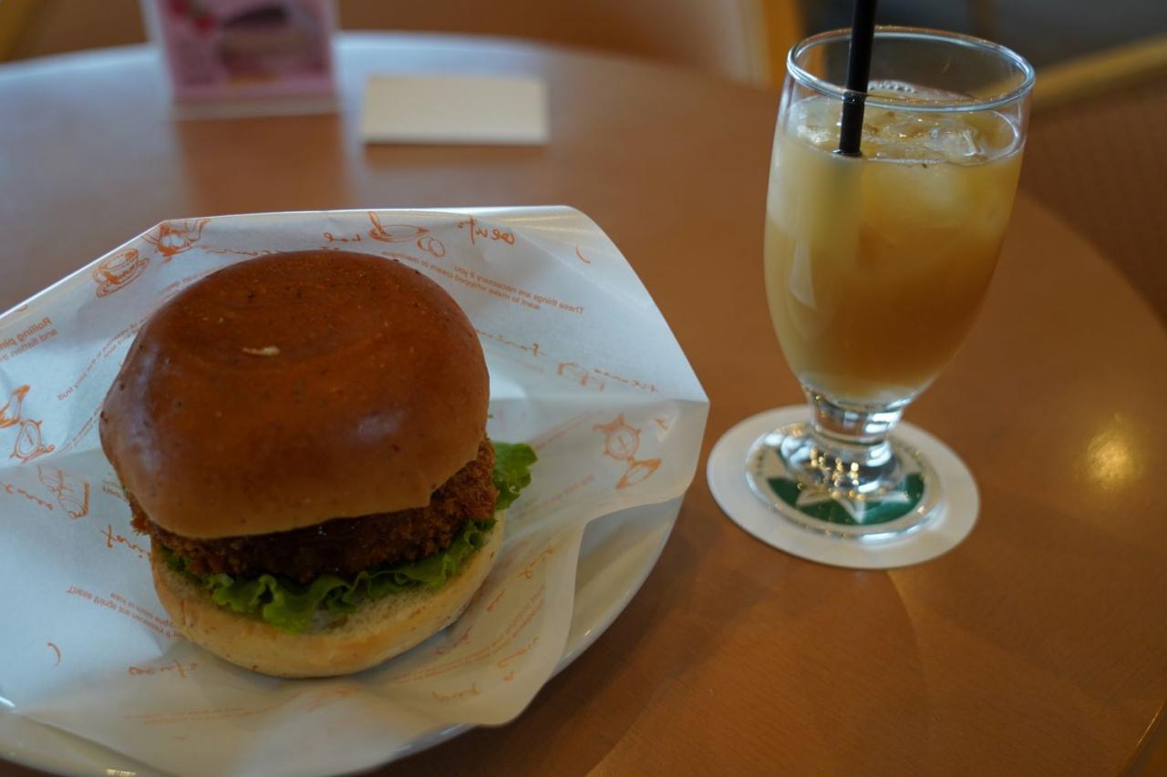 上杉神社の近くまで来ると、微妙な時間である。ちょうどお昼時であったので、近くの上杉城史苑に入ってみる。しかし、レストランは臨時休業である。カフェ『ル・シエル』と言う喫茶があり、食事も出来るようだ。バスの時間があるので尋ねてみると、米沢牛コロッケサンドがすぐ出来ると言うので、それとリンゴジュースを注文。出てきたそれは、結構な大きさがあった。味は、いまひとつである。