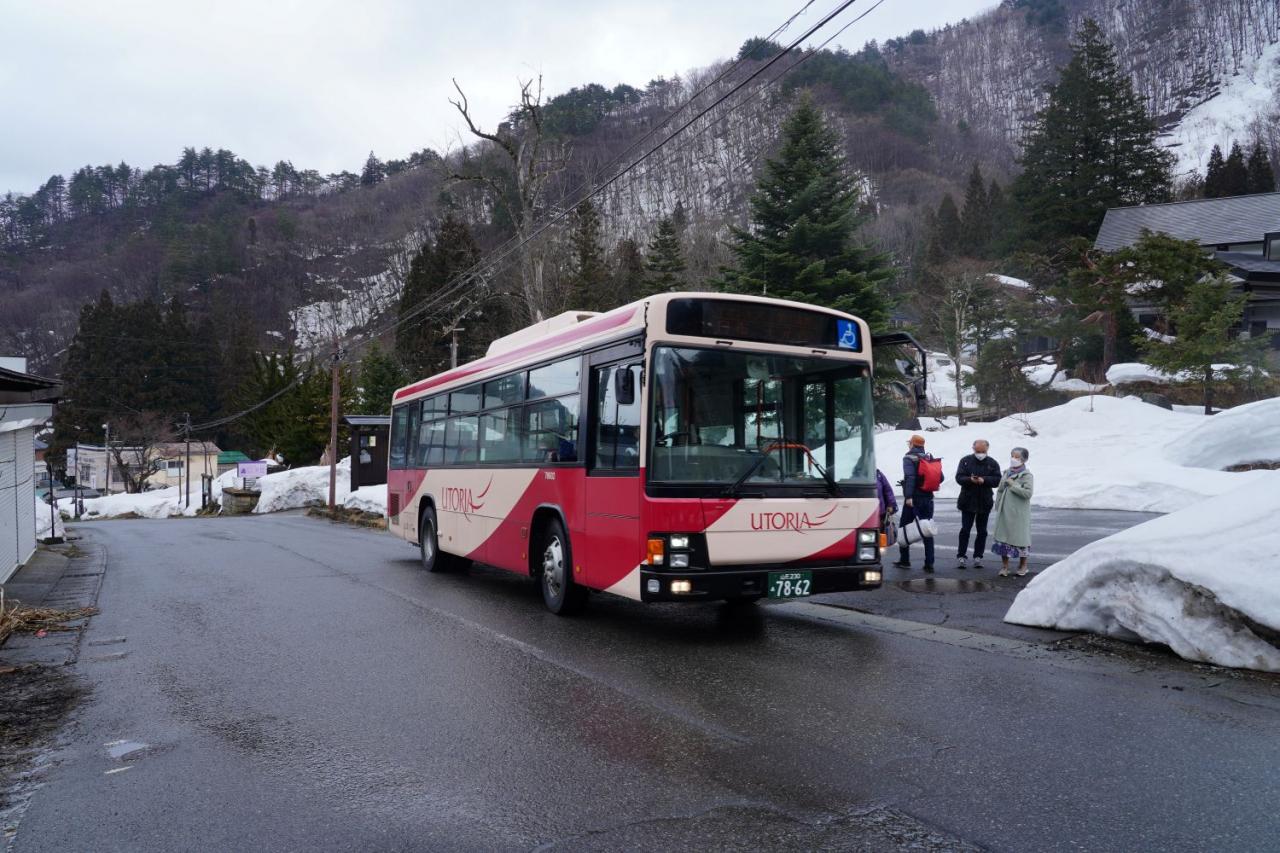 しばらくすると、米沢駅行のバスがやって来た。マイクロバスである。かつては、大型の観光バスで運行されていたのだが、やはり乗客が減っているのだろう。