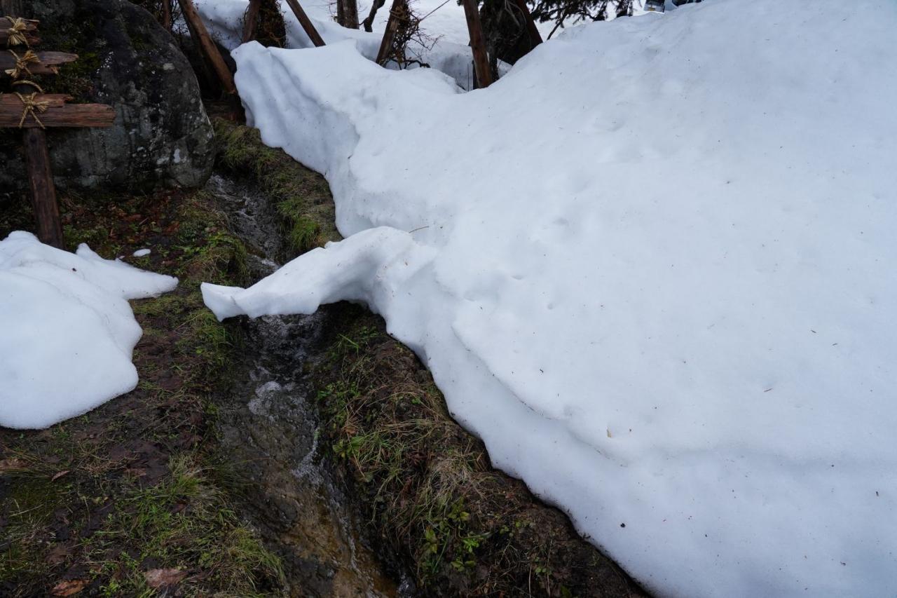宿へ上がる坂の両側には、まだ雪が多く残っている。雪解け水が豪快に流れ下り、雪国の早春を感じることが出来る。