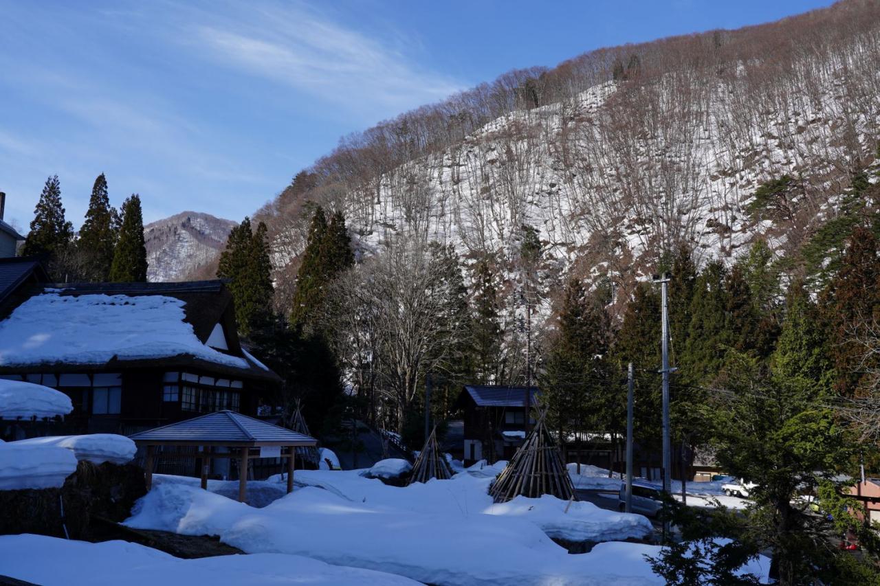 食後、もう一度温泉に浸かる。10時過ぎのバスまで、まだかなり時間があるので、もう一度温泉街を散策する。宿の前からは、焼失を免れた西屋の茅葺屋根と、斑に雪が残る山肌が見えた。