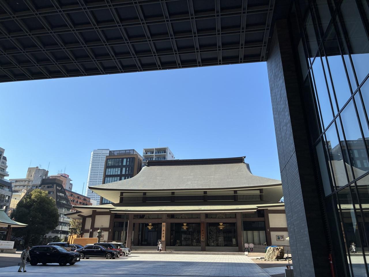 「日本初の寺院の山門と一体になったホテル」という触れ込みの、大阪エクセルホテル東急でお泊まり忘年会です。ホテル越しに見えるのは、400年以上の歴史ある南御堂(真宗大谷派難波別院)の本堂です。