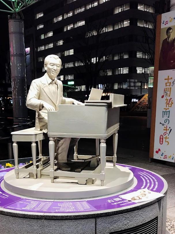 東口広場には福島出身の作曲家 古関裕而氏がピアノを弾いている像がライトアップされています