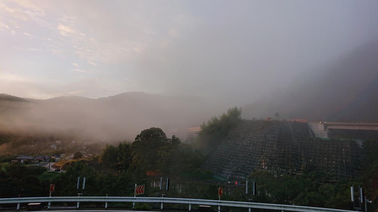 外へ出てみると、宿の周囲には朝もやがかかっています。 -