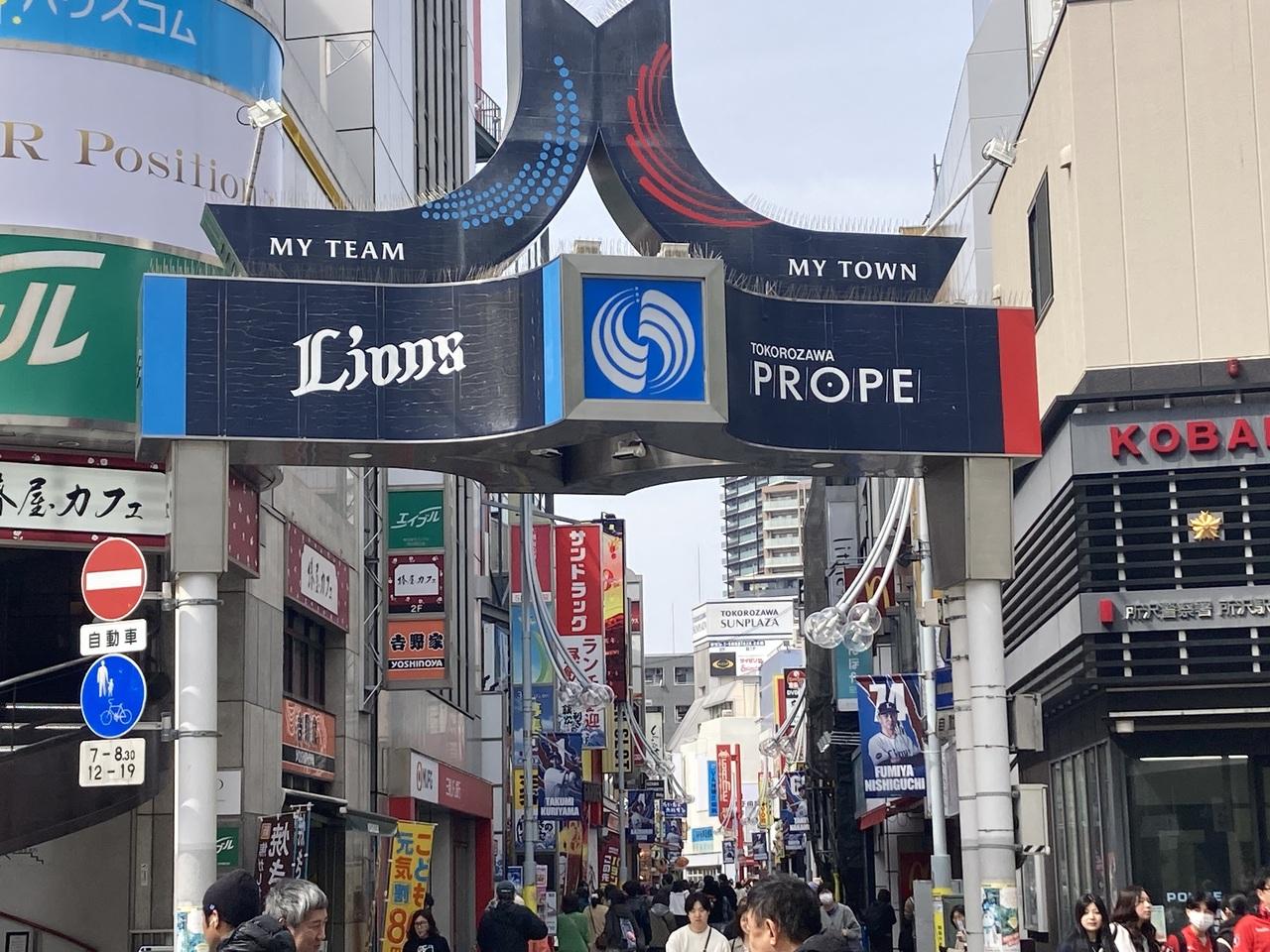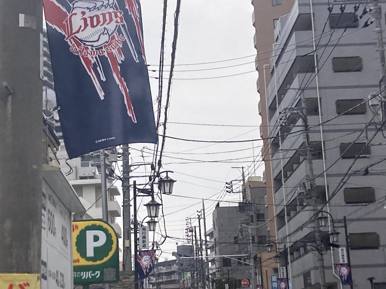 西武ライオンズの選手の旗がたくさん掲げられている。所沢プロペ商店街 市場・商店街