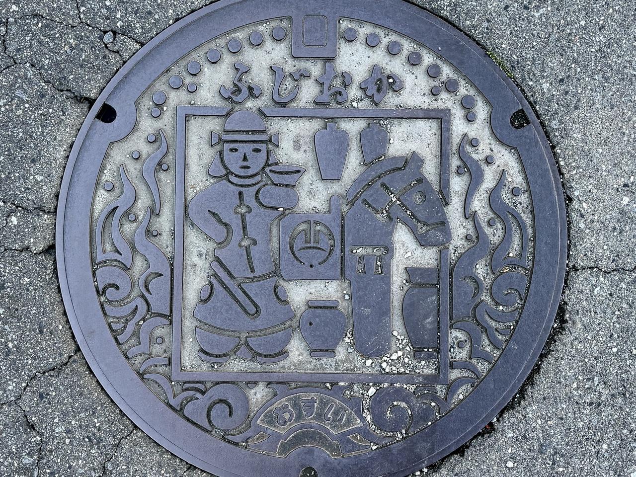 下部中央にカタカナのフの字を二つあわせ中に丘を表わした市章。その下に「ふじおかし」「おすい」の文字。 -