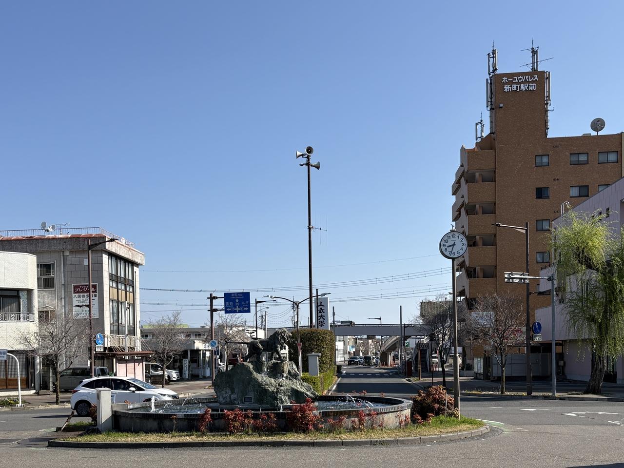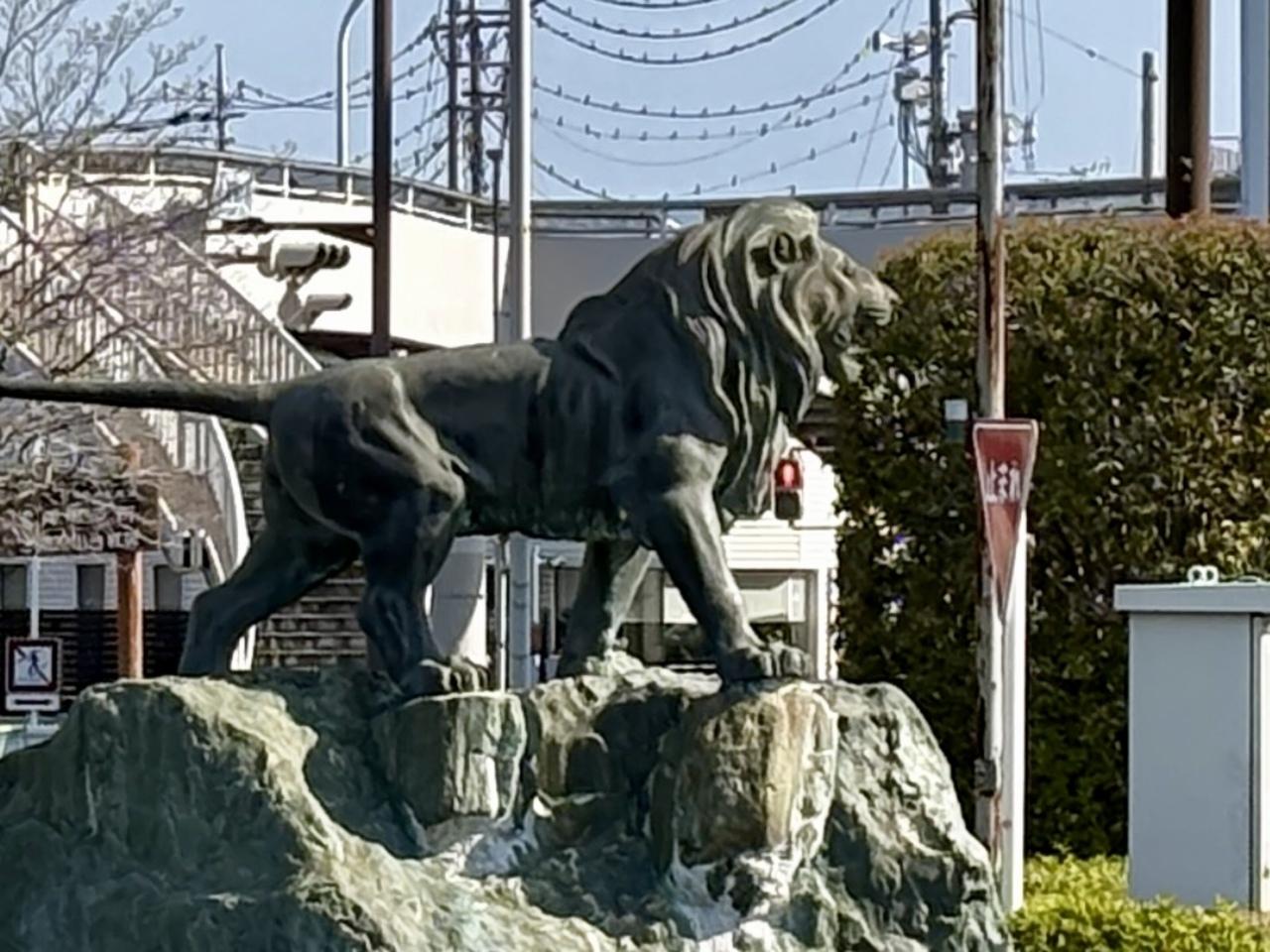 駅前のロータリーの中央にライオン像が設置されています。ライオンズクラブ寄贈。