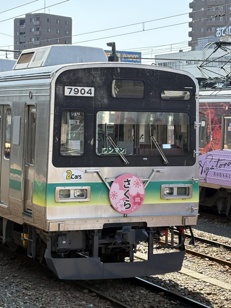 桜のヘッドマークを付けた秩父鉄道の7500・7800系電車(7904号)。