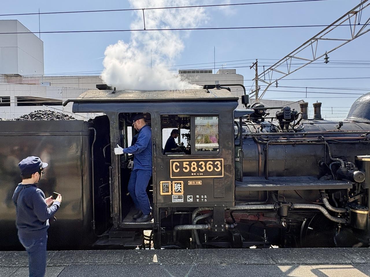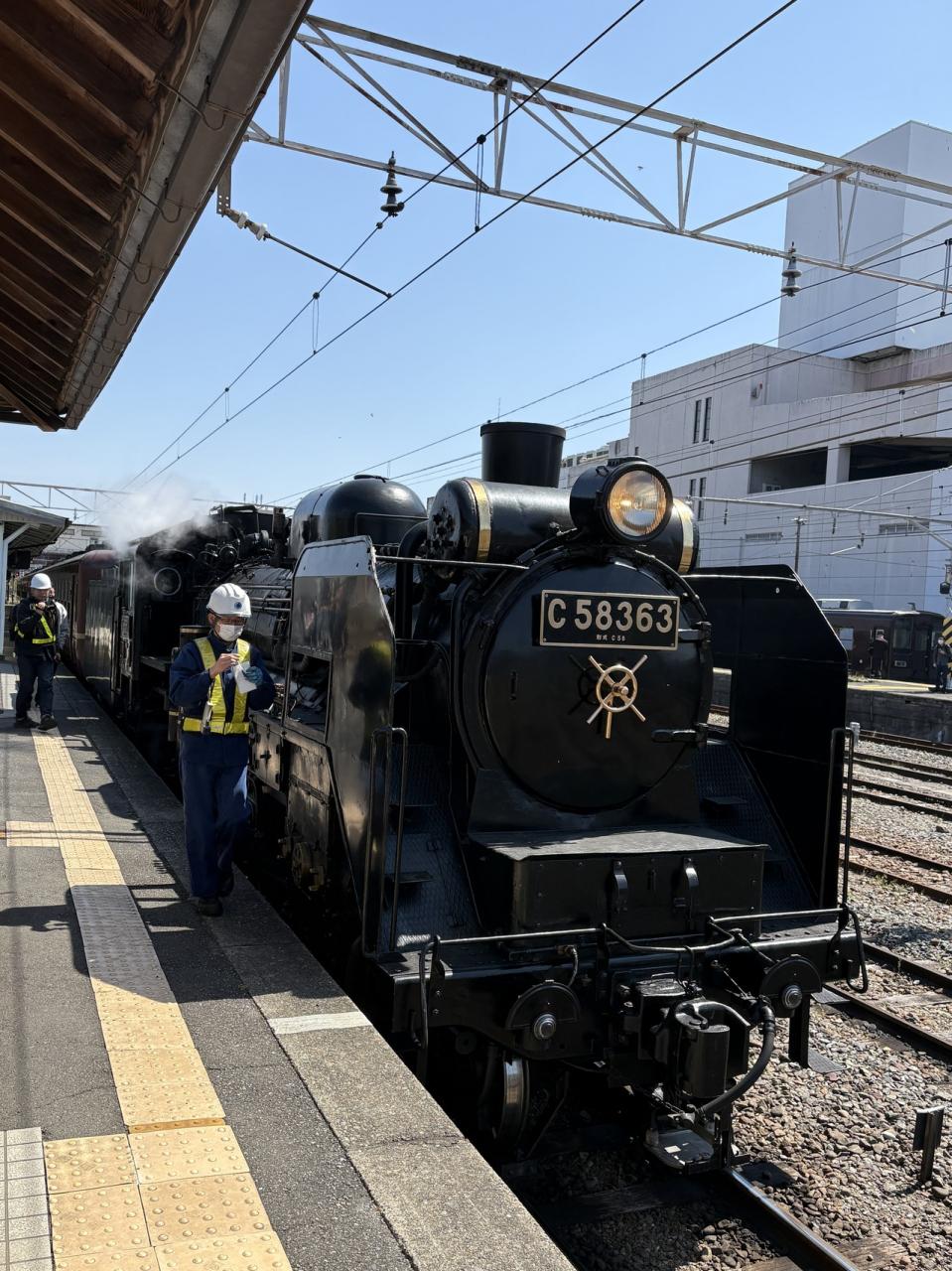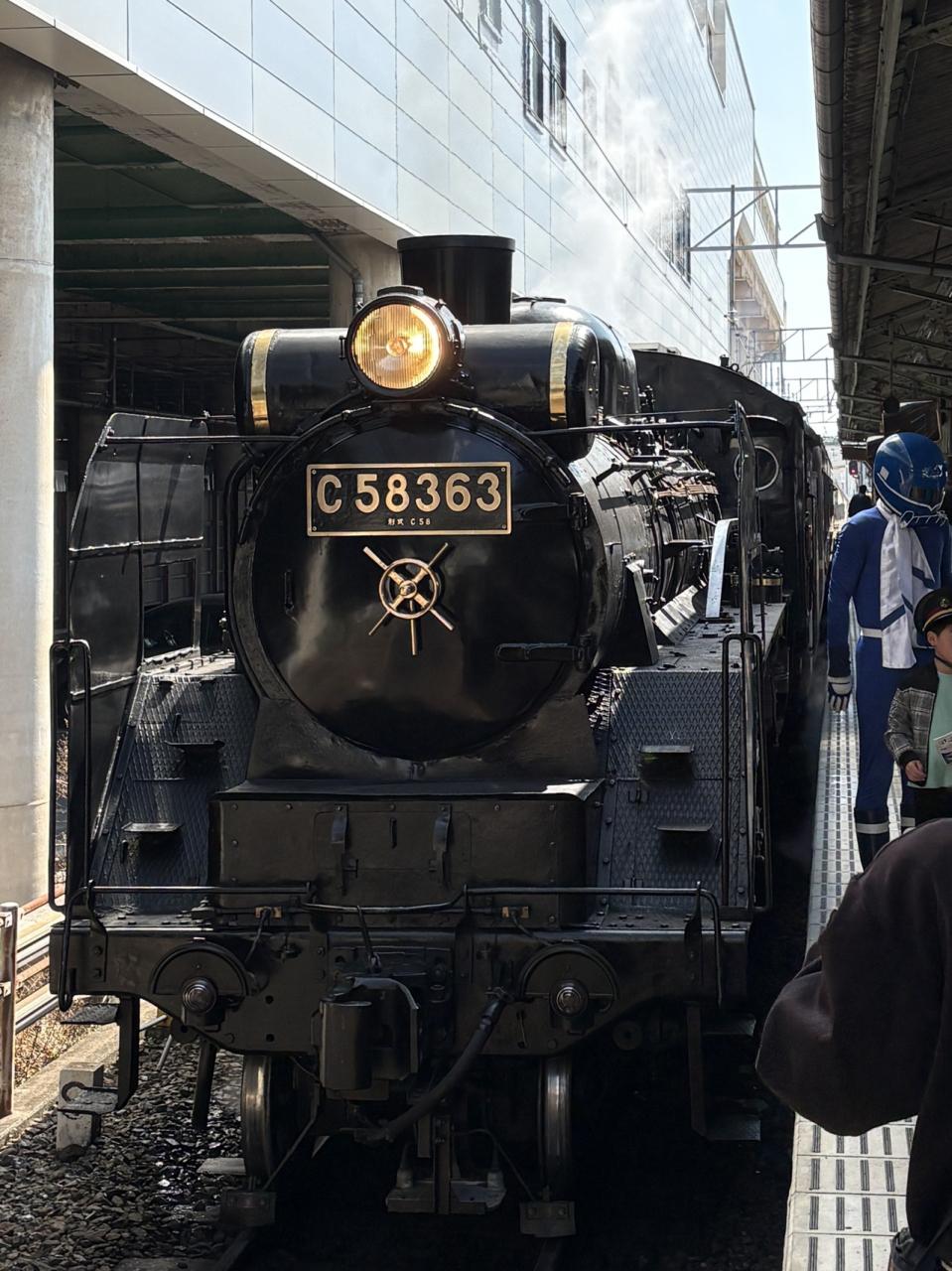 車両編成は、蒸気機関車(C58363)+炭水車(テンダー)+12系客車4両となっています。 -