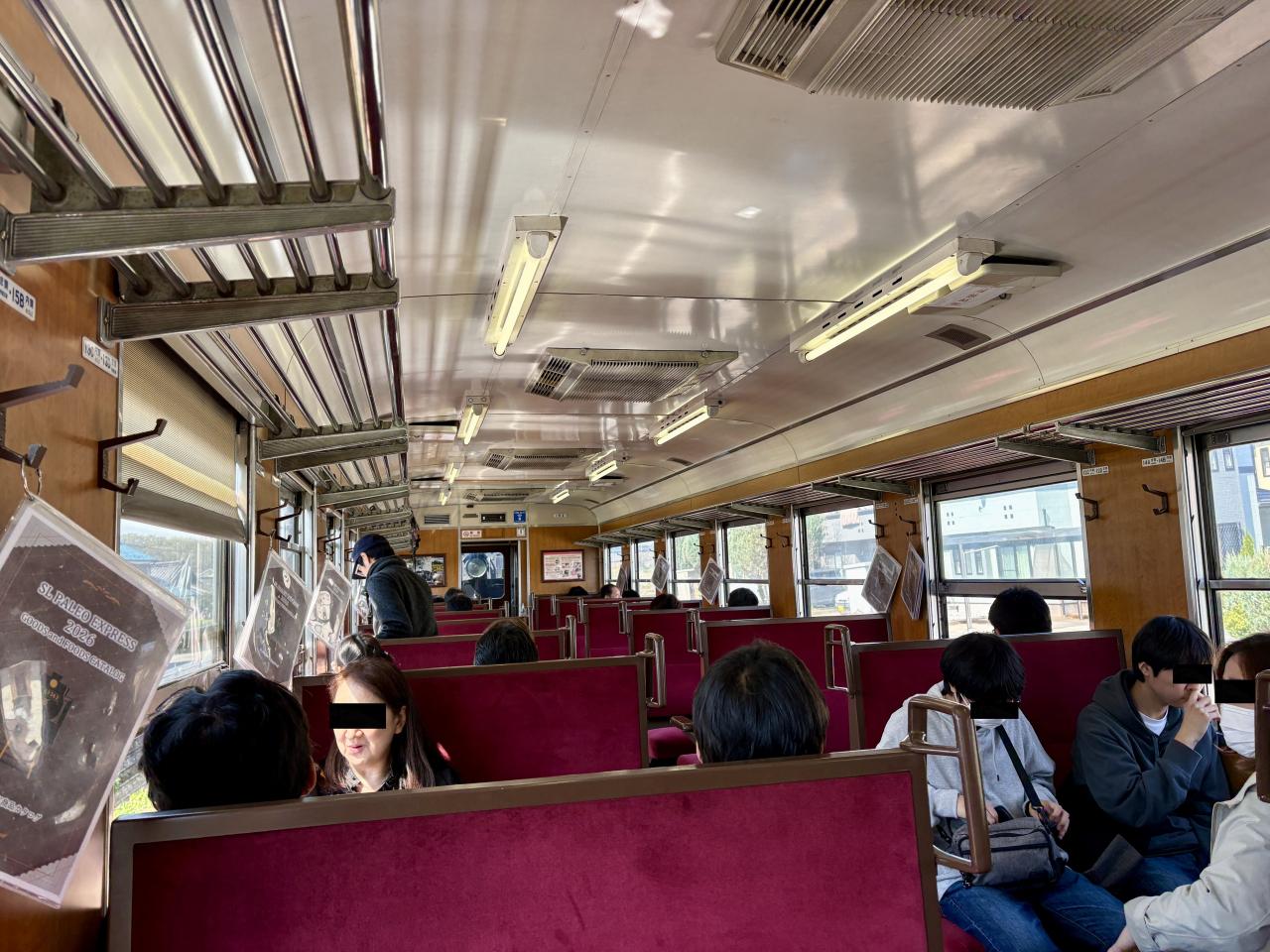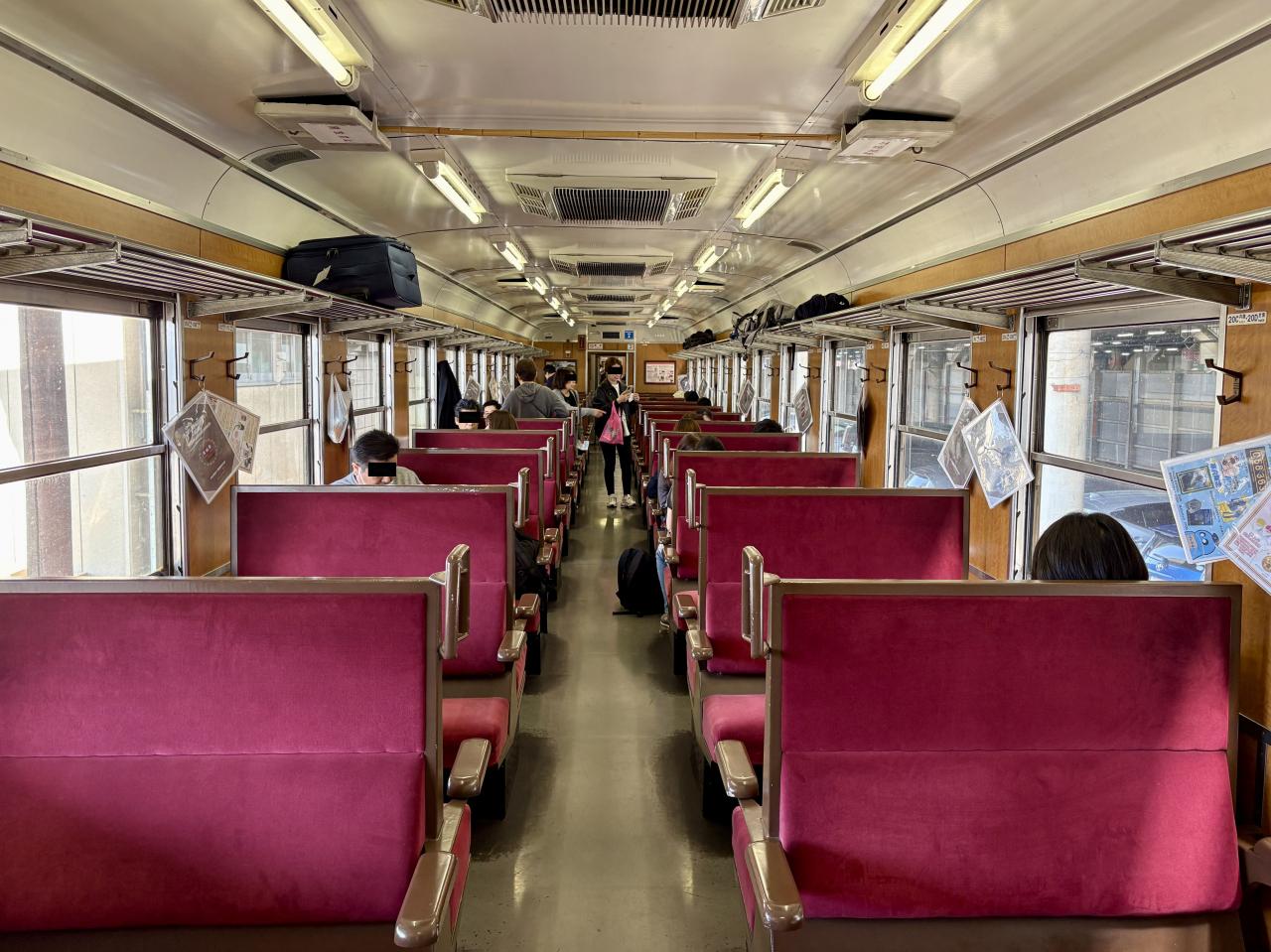 座席はワインレッド色の生地、 壁は木調にするなど、車内を茶系色に統一した昭和レトロなSL列車となっています。
