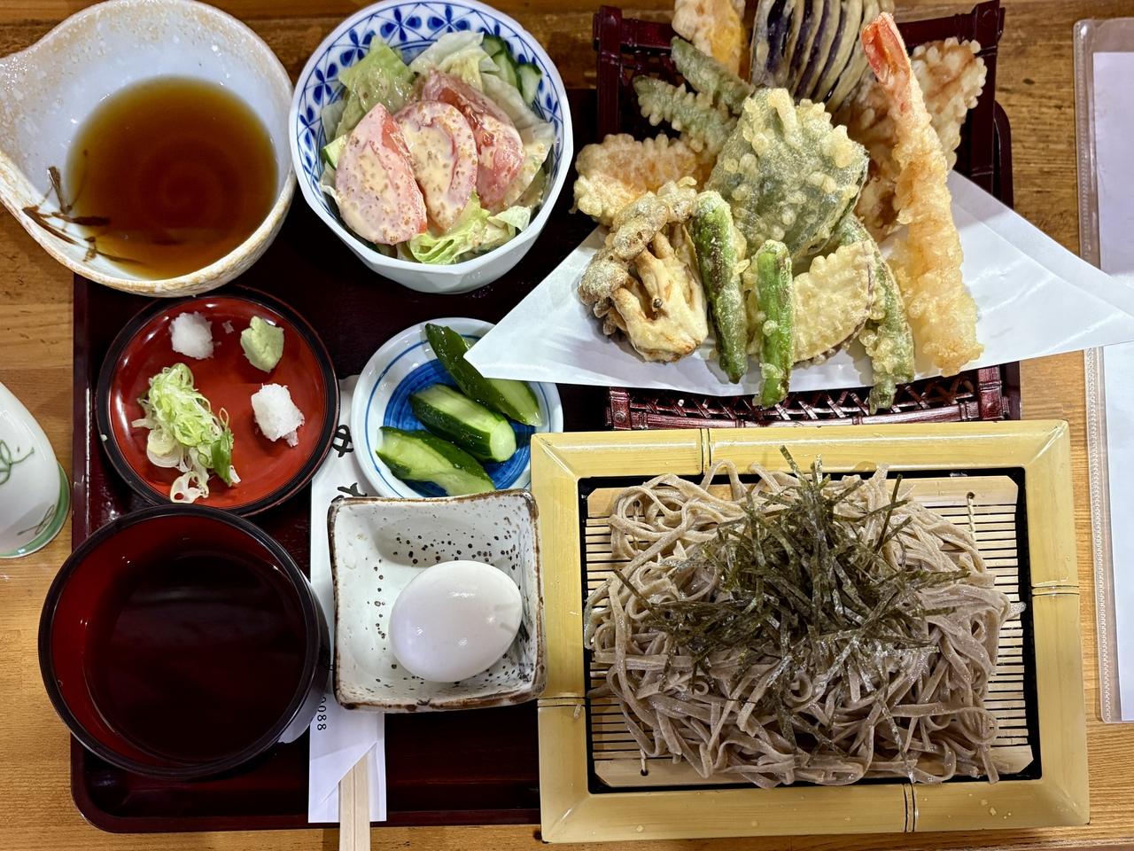 胡麻だれのサラダ、天ぷらは海老と野菜6種、茹で玉子が付いていました。とても美味しくいただきました。蕎麦は1枚で充分な量がありますが、大盛りを注文してる方が多かったです。