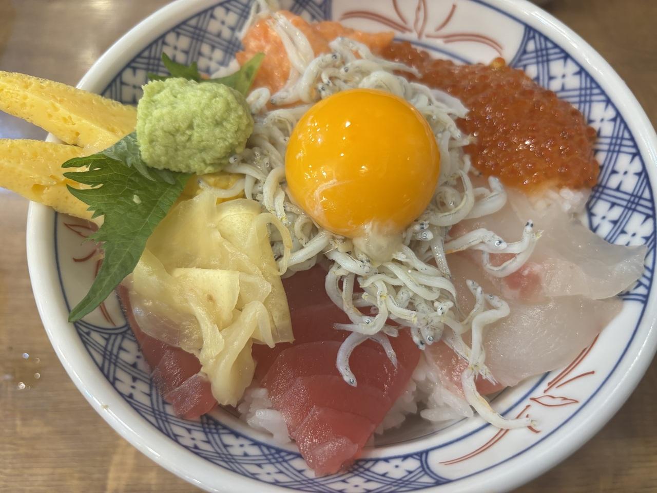 まぐろ、鯛、サーモンねぎとろ、しらす、いくら、卵が乗っていて、全部美味しかったです。