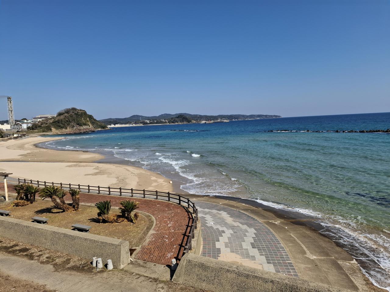 空港の下を通る小道を抜け、こちらは大浜です。なかなかきれいな海と砂のビーチで、夏はにぎわうでしょう