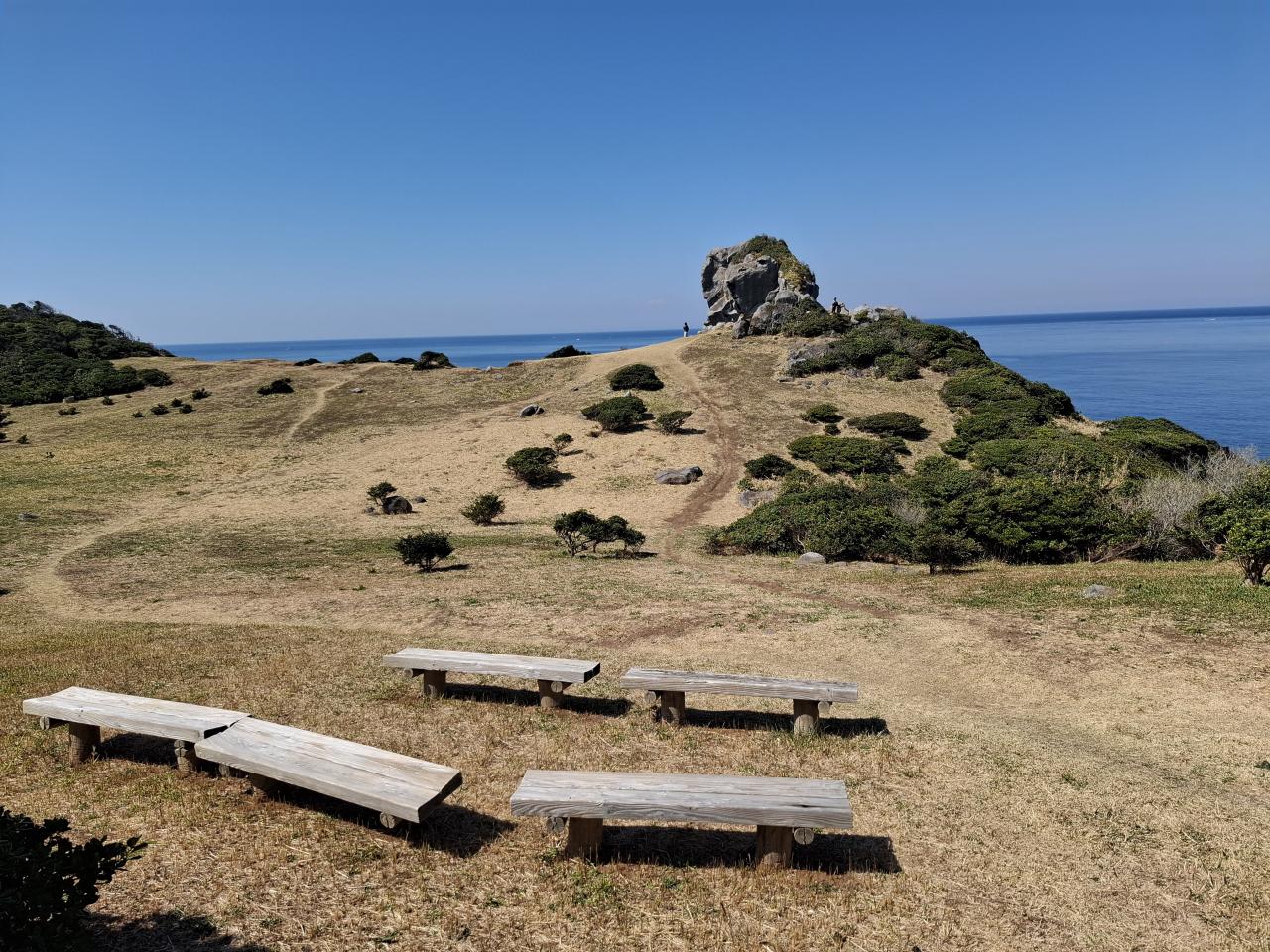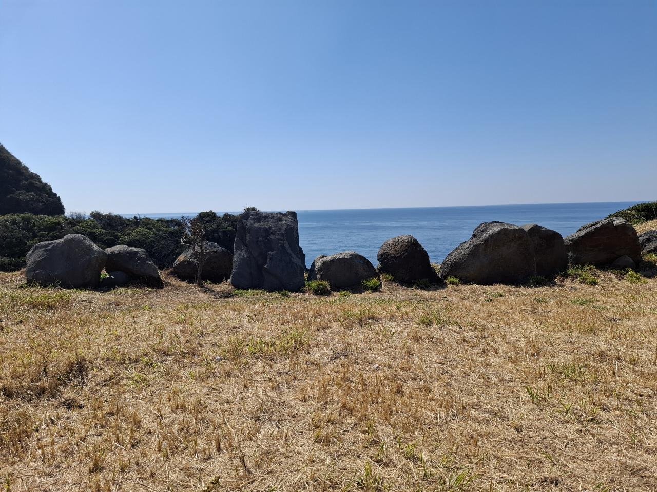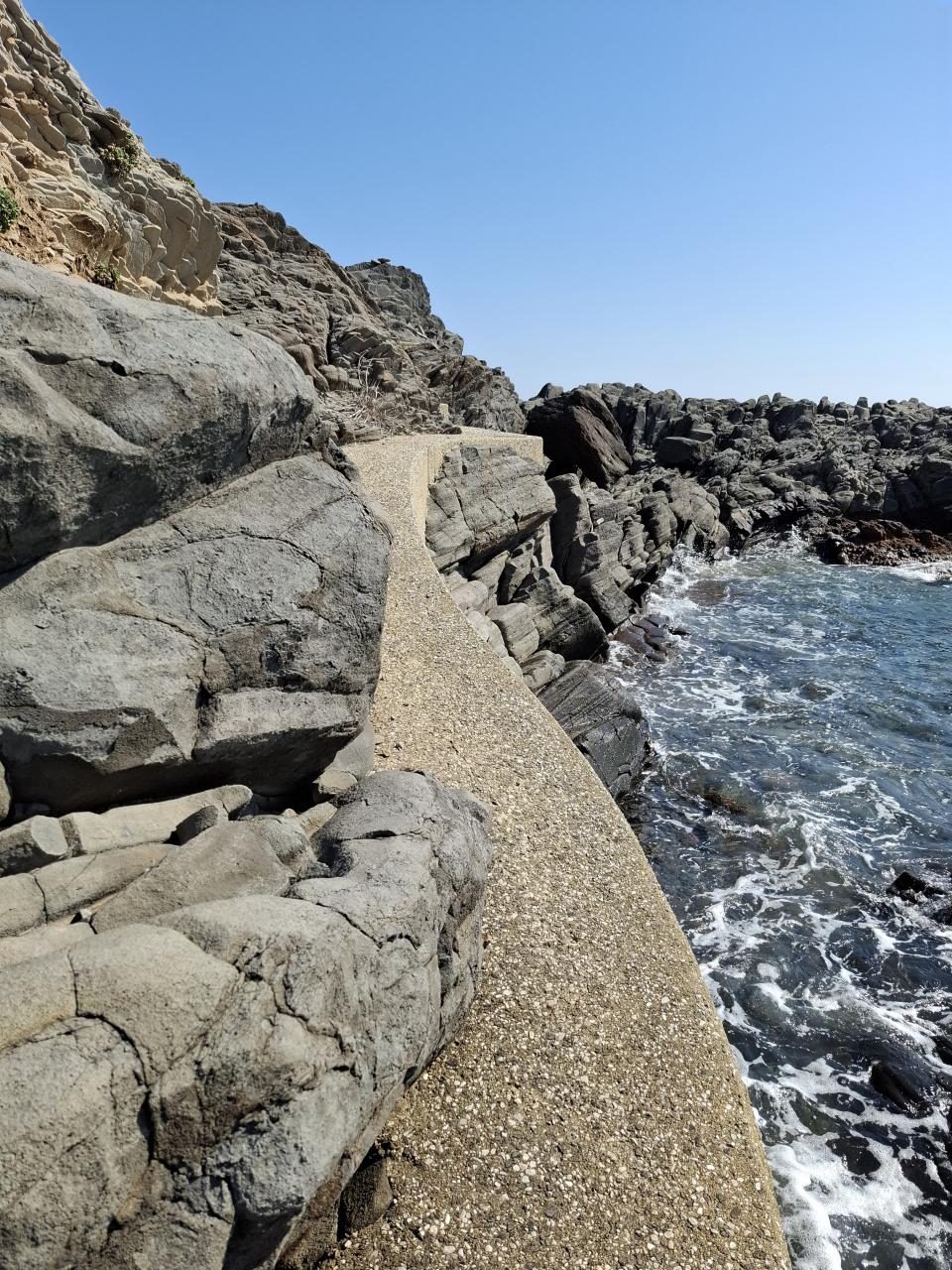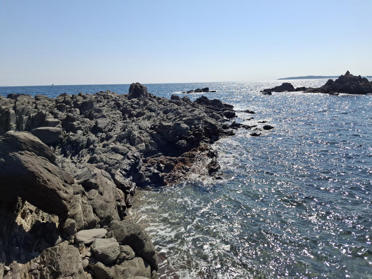 玄武岩でできているそうです。向こうに見える半島は緒津方向ですね。
