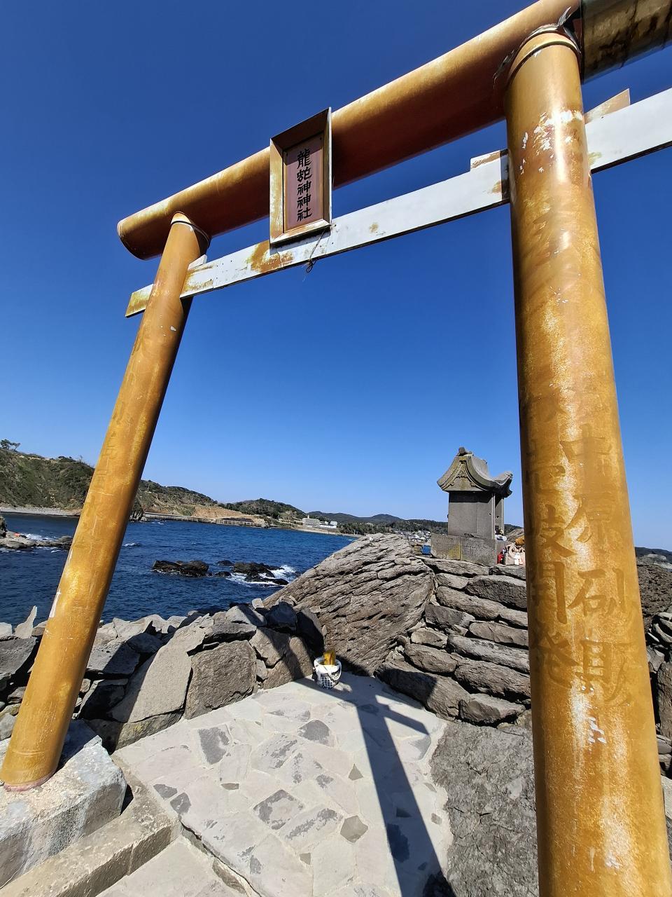 かなり下って、海の岩を挟んで、鳥居が見えてきます。龍神崎の龍蛇神社です
