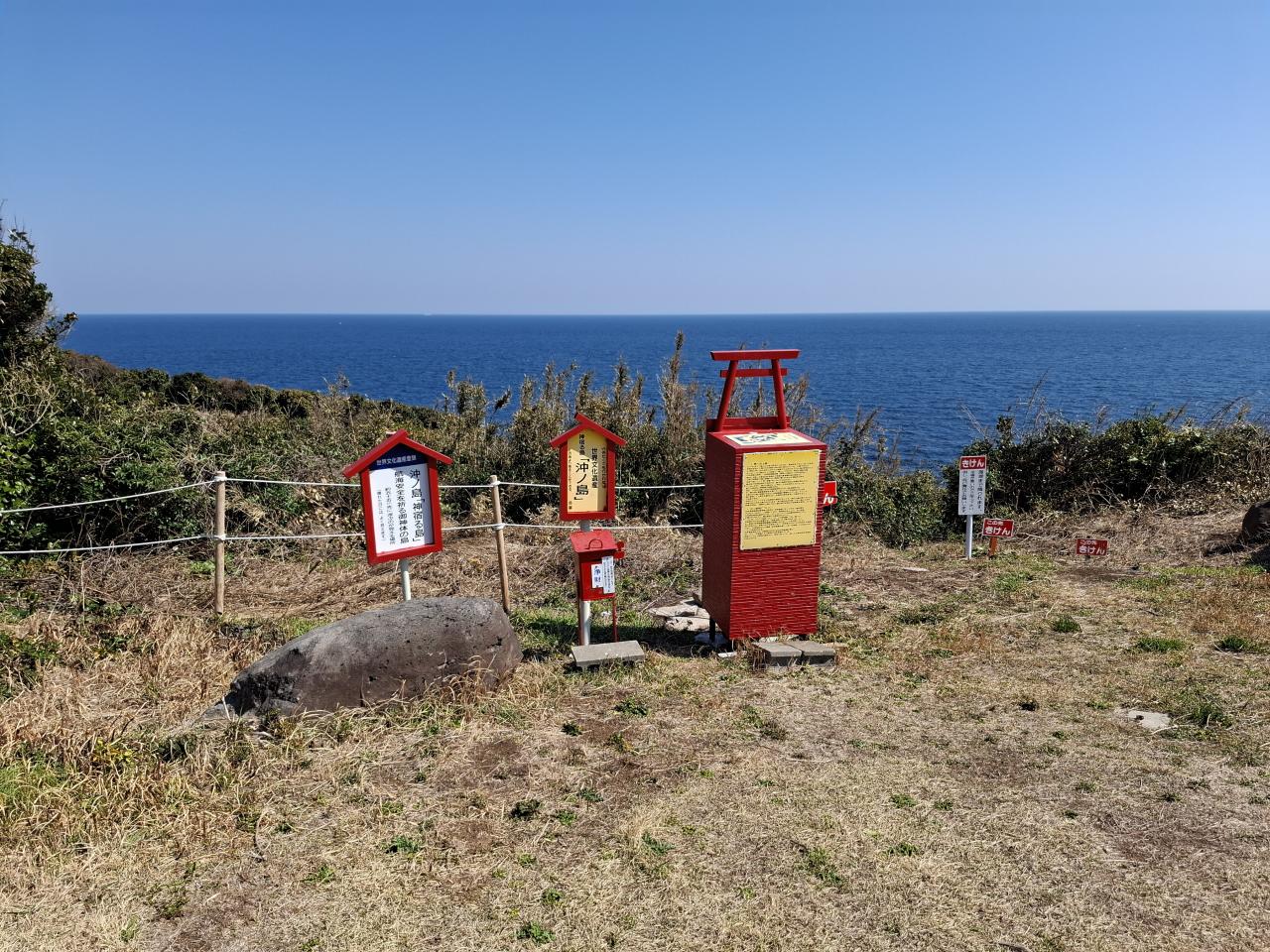 目を凝らしましたが、残念ですが沖ノ島を見ることできず、ただしっかりと遥拝しました。2年前に大島の沖津宮遥拝所から拝みましたが、今度は三角形の西南角から参拝です