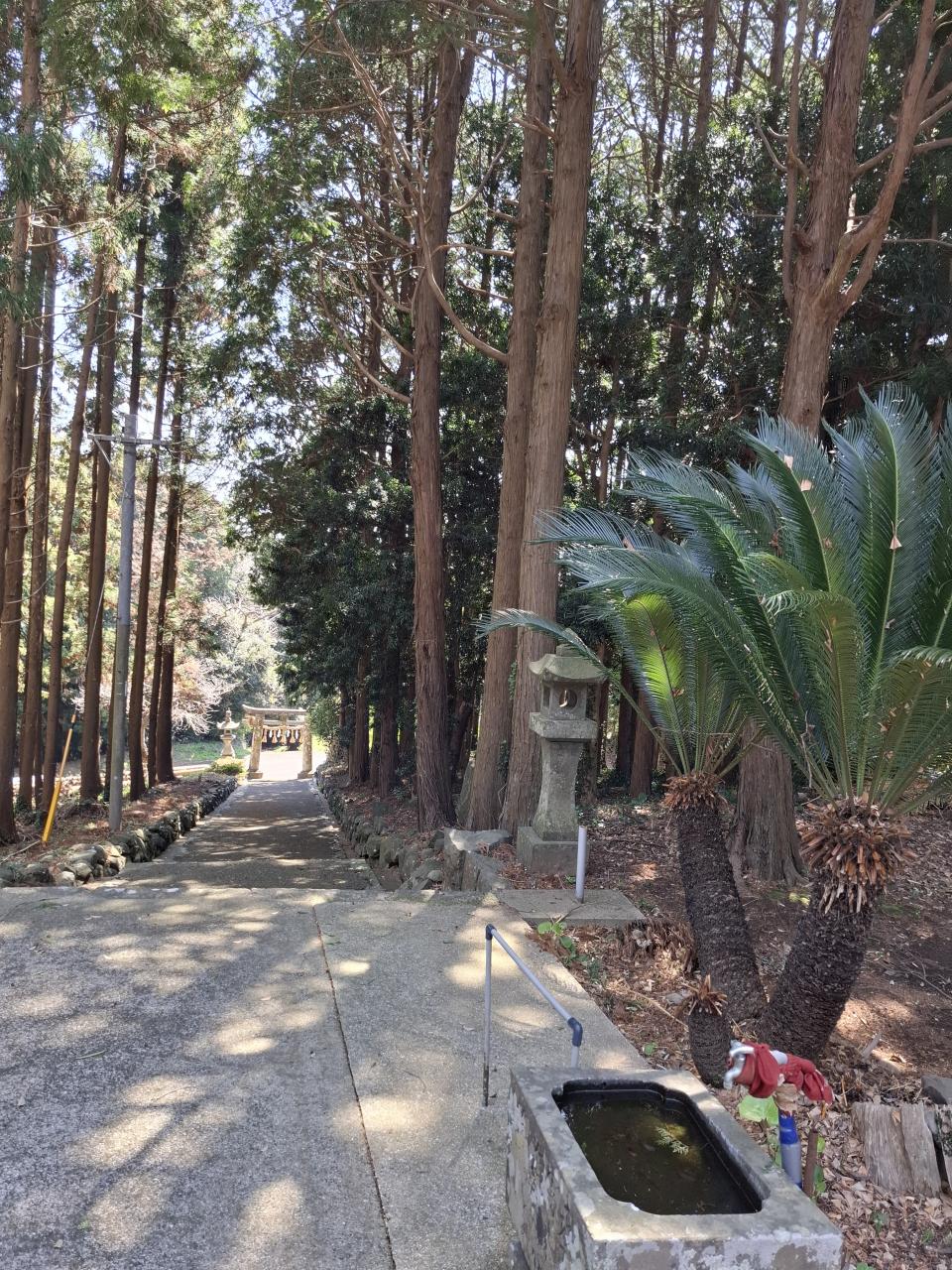 右のソテツが南国らしい。階段ではない坂道の参道です。