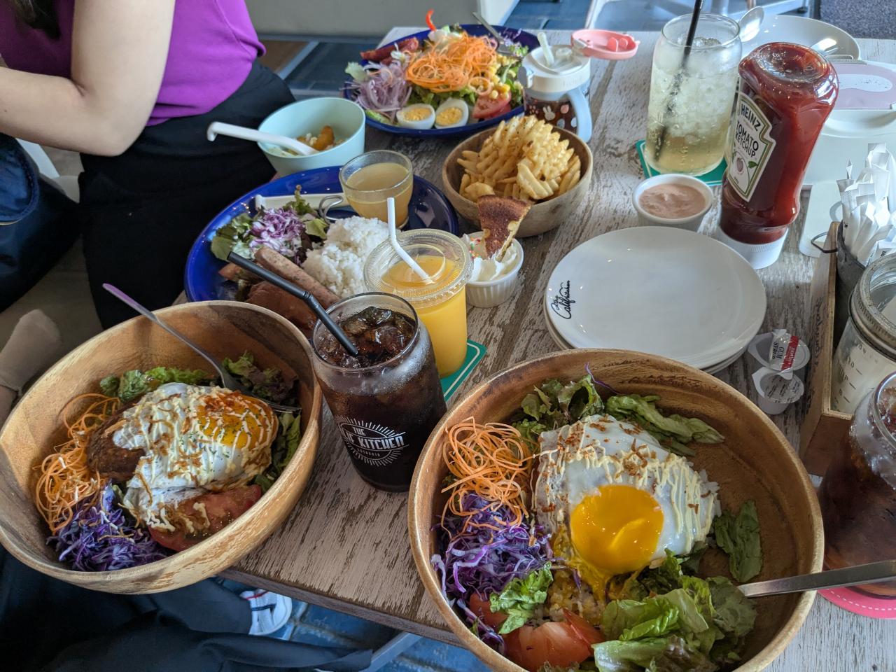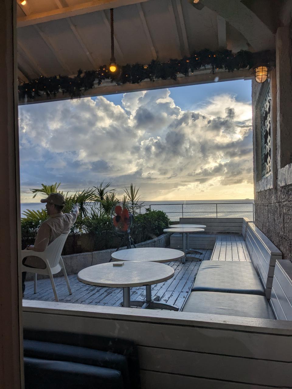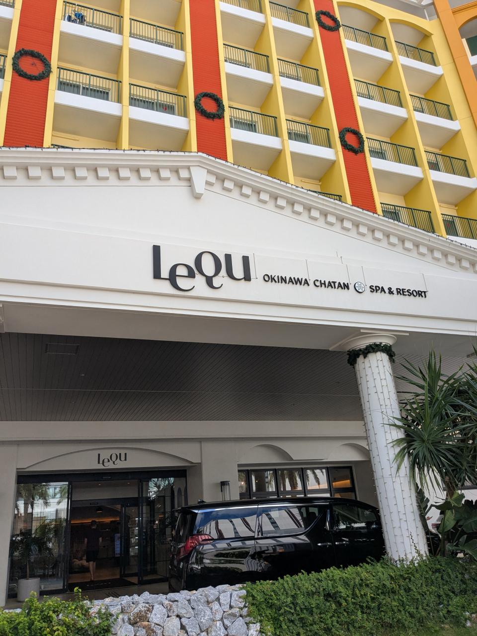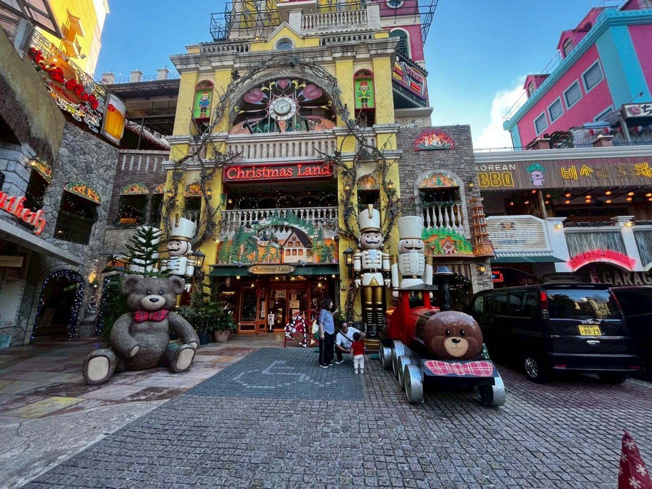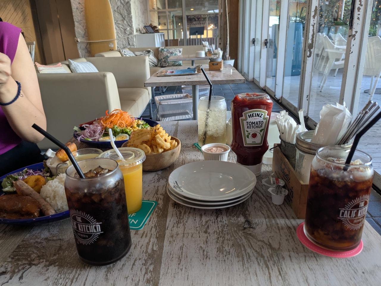 予約済みのレンタカーを借りてアメリカンビレッジに向かう。ビレッジ内のホテルにチェックインしてから、ホテル近くのシーサイドピル3階、クリスマスランドのビル3階のカリフキッチンで夕日を見ながら食事。