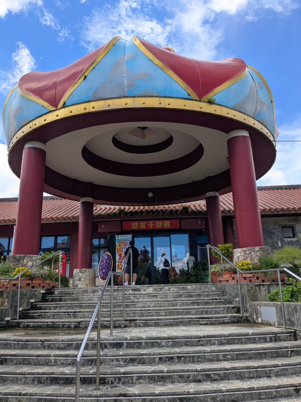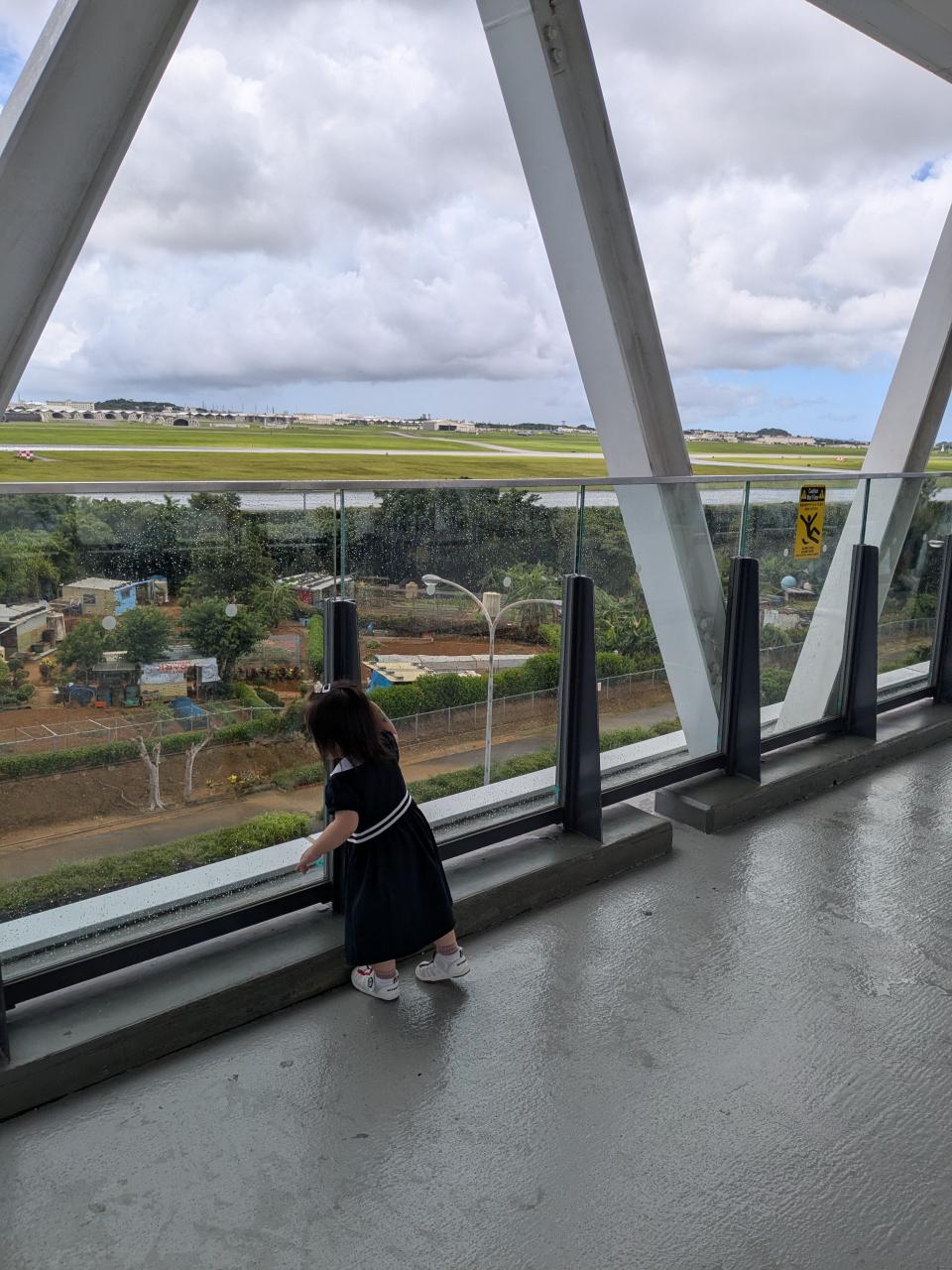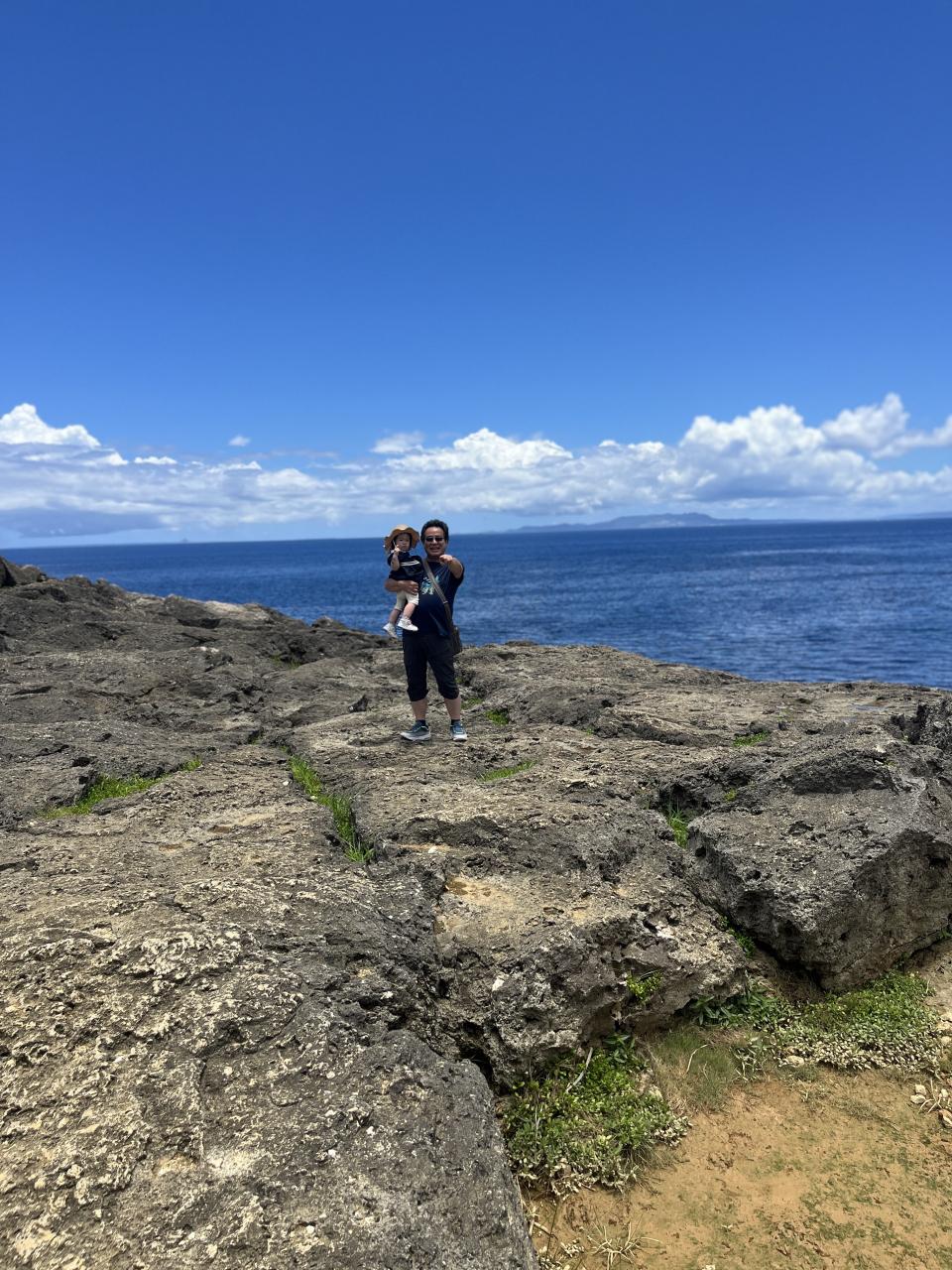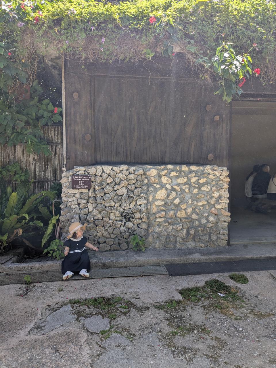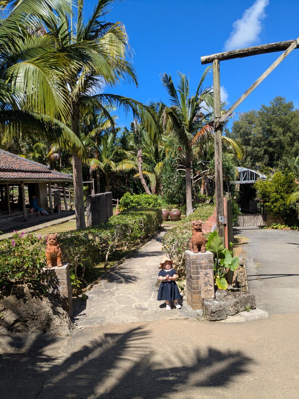2日目はホテルで朝食時、嘉手納基地、御菓子御殿、残波岬、琉球村に立ち寄り、恩納村のホテルにチェックイン後、孫とプライベートビーチで海に浸かった。