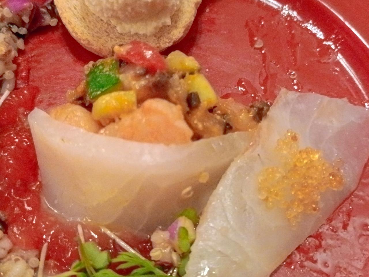 海老とズッキーニのタルタルと真鯛のマリネ、カリフラワー&リコッタのディップとクルトン
