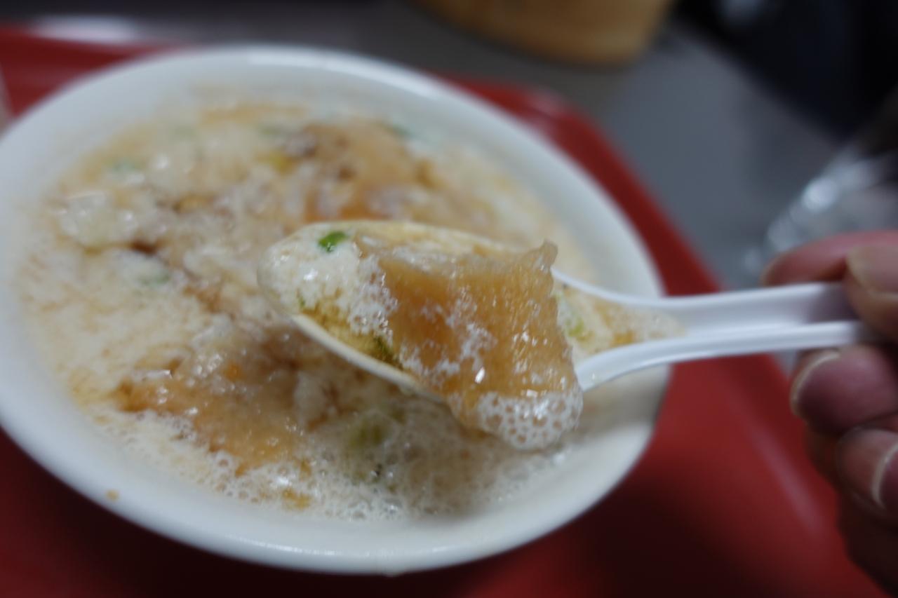 店内の熱気で、少し汗ばんでくる頃…鹹豆漿に辣油も忘れちゃいかんのでした。ん、引き締まる。