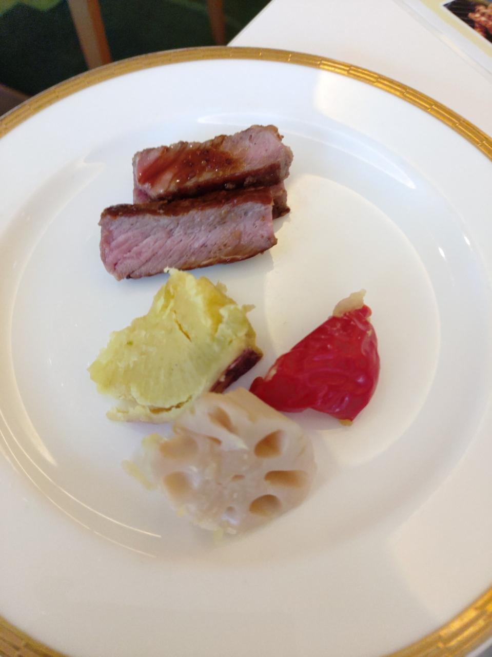 オープンキッチンから牛肉ステーキと温野菜。