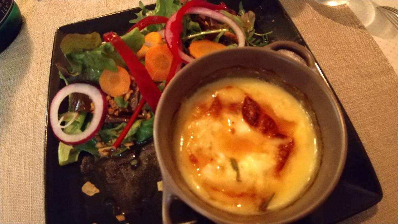 前菜はオニオングリル、そしてこのサンマルスランのローストSaint-Marcellin Roti。サンマルスランというのはチーズの一種で、そのローストということでオーブンで焼かれたトロトロのチーズをいただきます!これチーズ好きにはたまらない一品。